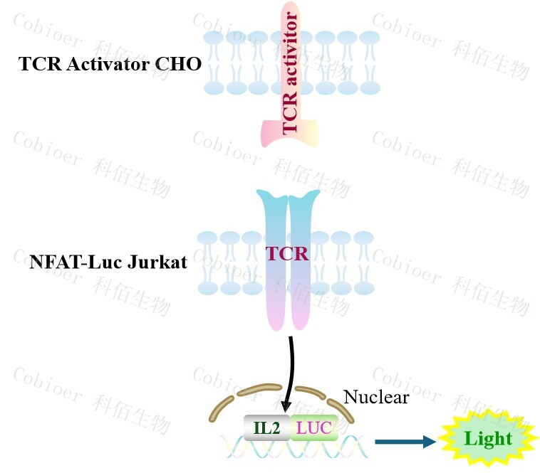 TCR Activator CHO 報告基因藥靶模型很好的模擬了體內 TCR 的信號轉導過程,原理見下圖所示。![]() Figure 1. TCR Activator CHO 細胞模型原理圖 |