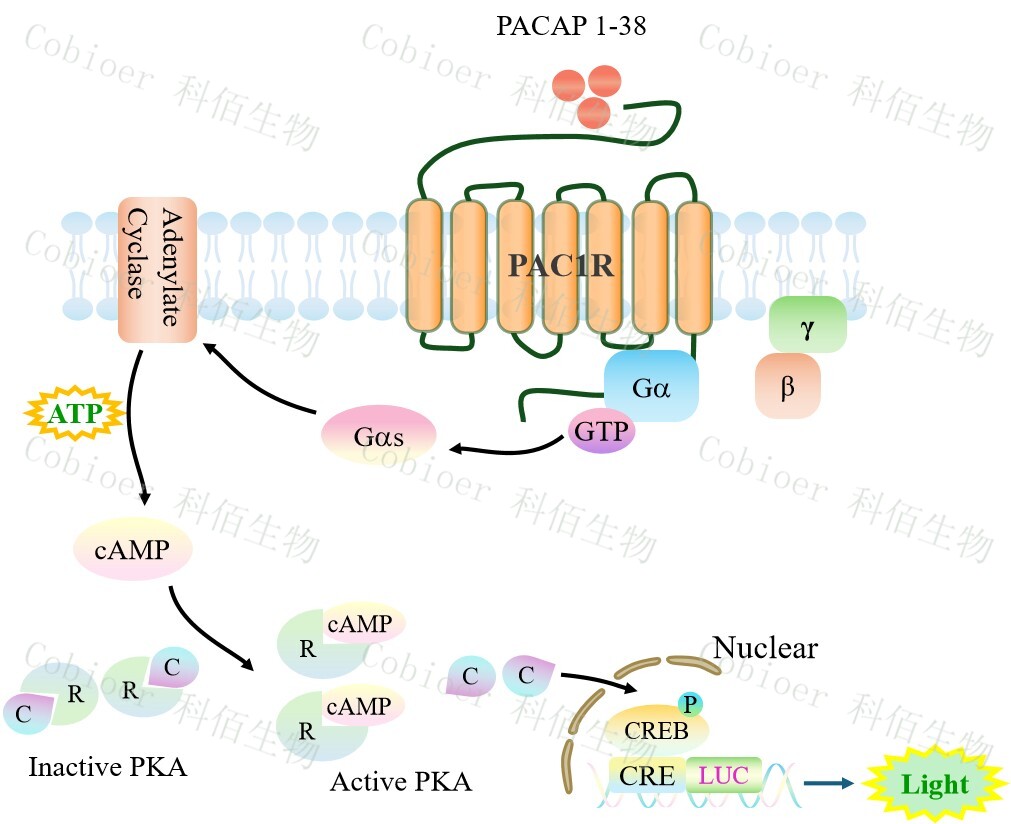 PAC1R CRE-Luc HEK293 報告基因藥靶模型很好的模擬了體內(nèi) PAC1R 的信號轉(zhuǎn)導過程,原理見下圖所示。![]() Figure 1. PAC1R CRE-Luc HEK293 細胞模型原理圖 |