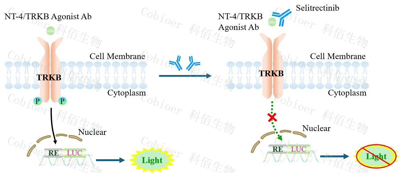 TRKB Effector Reporter Cell 報(bào)告基因藥靶模型很好的模擬了體內(nèi) TRKB 的信號(hào)轉(zhuǎn)導(dǎo)過(guò)程,原理見下圖所示。![]() Figure 1. TRKB Effector Reporter Cell 模型原理圖 |