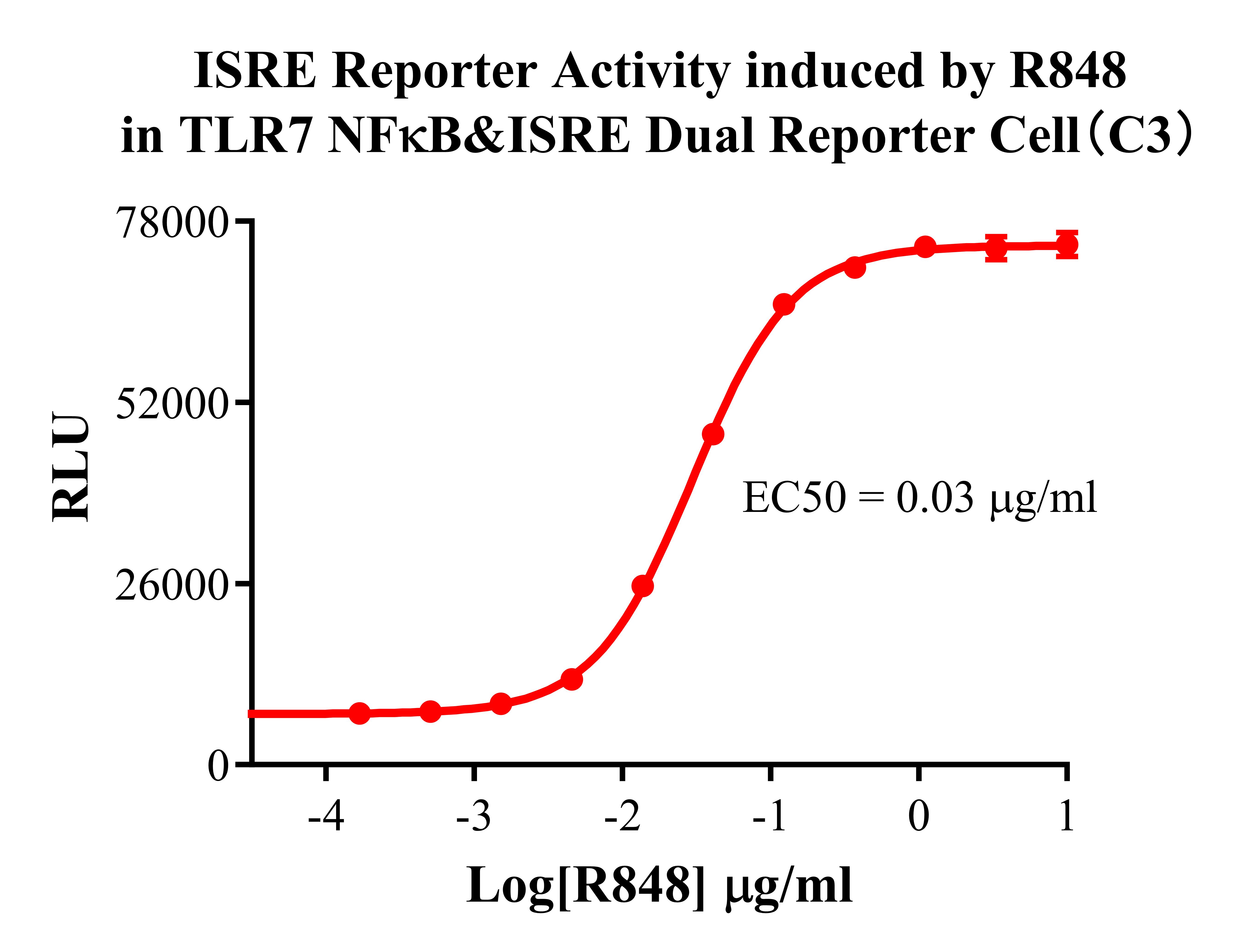 ![]() Figure 2.NFκB Reporter Activity induced by R848 in TLR7 NFκB&ISRE Dual Reporter Cell(C3). ![]() Figure 3. ISRE Reporter Activity induced by R848 in TLR7 NFκB&ISRE Dual Reporter Cell(C3). |