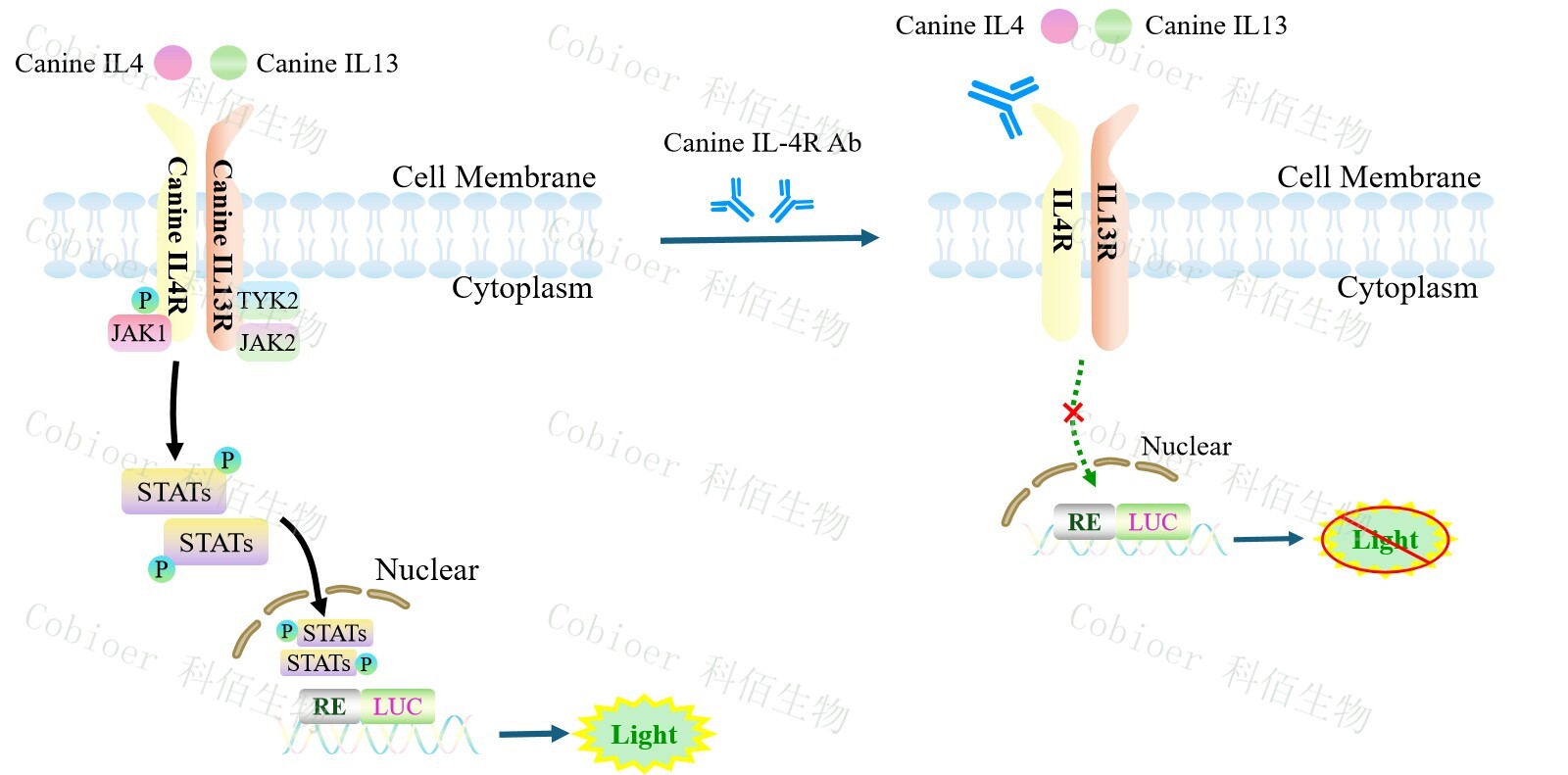 Canine IL4/IL13 Dual Effector Reporter Cell 報告基因藥靶模型很好的模擬了體內(nèi) IL4/IL13 的信號轉(zhuǎn)導(dǎo)過程,原理見下圖所示。![]() Figure 1. Canine IL4/IL13 Dual Effector Reporter Cell 細胞模型原理圖 |