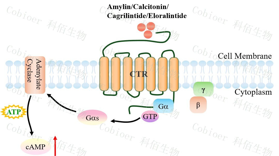 | 降鈣素基因相關(guān)肽(CGRP)家族包括 CGRP 本身、降鈣素(CT)、腎上腺髓質(zhì)素 (AM)和胰島淀粉樣肽(AMY)。 胰淀素(Amylin)受體的三種類型的已被確定,即 AMY1,AMY2 和 AMY3。胰淀素 受體屬于 B 類 GPCR,是異二聚體復合物,由降鈣素受體(CTR)與受體活性修飾蛋白 (RAMPs)結(jié)合形成。該受體的 CTR 組分具有相同的 GPCR 結(jié)構(gòu):7 個跨膜相互連接的α- 螺旋,將細胞外信號傳遞到細胞內(nèi)細胞質(zhì)信號級聯(lián)。RAMP 有三種類型(RAMP1、 RAMP2 和 RAMP3),它們共享 31%的氨基酸序列,具有相似的基本結(jié)構(gòu)。RAMP 是將 CTR 轉(zhuǎn)運到細胞膜并調(diào)節(jié)其配體特異性的重要肽,它可以改變特定 GPCR 的藥理學、功能 和細胞運輸。 哺乳動物細胞中 Amylin 受體的激活已被證明可以提高 cAMP,并被認為與 Gs 蛋白和 腺苷酸環(huán)化酶的刺激有關(guān)。在 RAMPs 的存在下,其與胰淀素的結(jié)合親和力可以被修飾。 CTR 和 RAMP1 或 CTR 和 RAMP3 的異質(zhì)結(jié)構(gòu)被認為有利于與胰淀素結(jié)合,介導大腦中的 生理功能。AMY3 的激活刺激 G 蛋白 Gαs,進一步控制腺苷酸環(huán)化酶(AC),隨后增加細 胞 cAMP。cAMP 與 PKA 調(diào)控亞基(R2)的結(jié)合誘導 PKA 四聚體全酶解離,導致 PKA 催 化亞基的激活。cAMP 激活的 PKA 參與調(diào)控 ERK1/2 的活性。ERK1/2 通路的觸發(fā)可能導致 Ca 2+分布不均勻,引發(fā)內(nèi)質(zhì)網(wǎng)和線粒體功能障礙,導致細胞死亡。此外,cAMP 刺激 AKT 進一步導致轉(zhuǎn)錄因子 cFos 的表達。 |