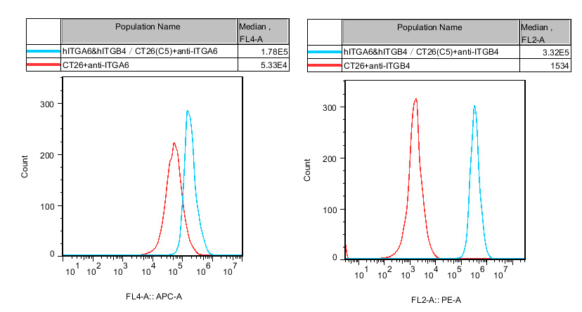 IV. Representative Data![]() Figure 1. Recombinant hITGA6&hITGB4/CT26 stably expressing hITGA6&hITGB4. |
