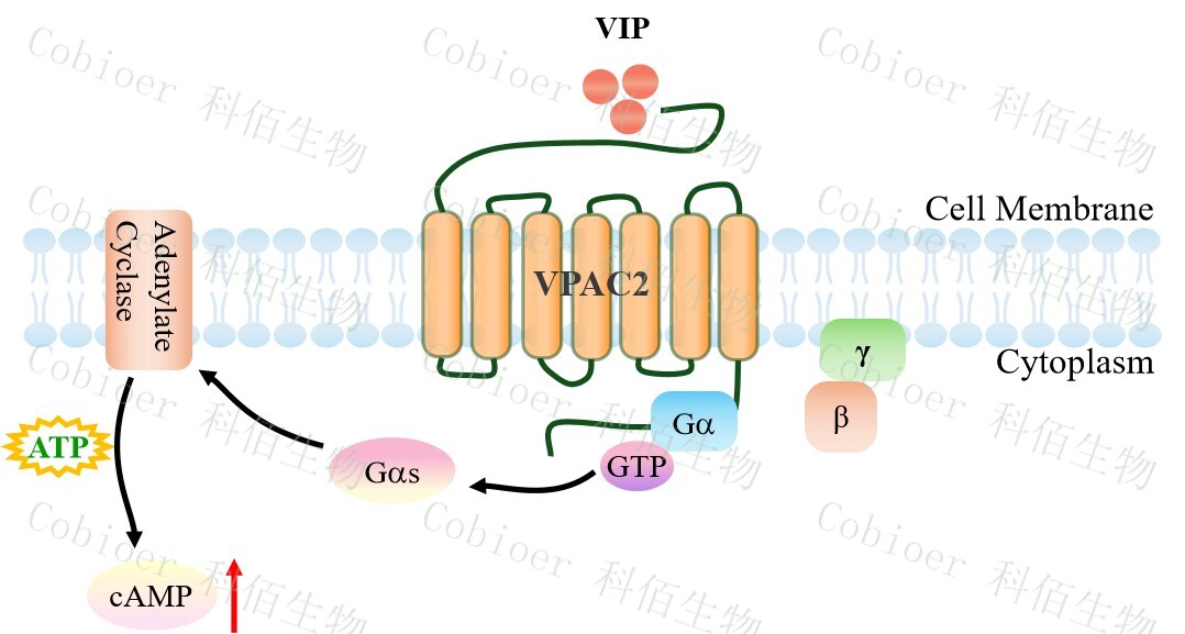 | PACAP/VIP 受體家族屬于 B 類 G 蛋白偶聯(lián)受體(GPCR),包含 PAC1R (PAC1)、 VPAC1R (VPAC1) 和 VPAC2R (VPAC2) 三個(gè)亞型,共同響應(yīng)神經(jīng)肽 PACAP(垂體腺苷酸 環(huán)化酶激活肽)和 VIP(血管活性腸肽)的調(diào)控,通過激活 Gs/cAMP-PKA 核心信號(hào)軸 (部分亞型偶聯(lián) Gq/PLC)廣泛協(xié)調(diào)神經(jīng)內(nèi)分泌、代謝穩(wěn)態(tài)與免疫調(diào)節(jié)。 VPAC2 受體(血管活性腸肽受體 2 型)作為 B 類 GPCR 的核心亞型,主要富集于下丘 腦視交叉上核(SCN)、胰腺β細(xì)胞、脂肪組織及骨細(xì)胞,以同等高親和力結(jié)合 VIP 和 PACAP,通過 Gs/cAMP-PKA 通路調(diào)控代謝穩(wěn)態(tài)與晝夜節(jié)律。VPAC2 的激活可同步 SCN 生物鐘基因(如 Per2)振蕩以維持睡眠-覺醒周期、促進(jìn)胰島素/胰高血糖素脈沖式分泌調(diào) 控血糖平衡、抑制破骨細(xì)胞分化并增強(qiáng)骨形成。 |