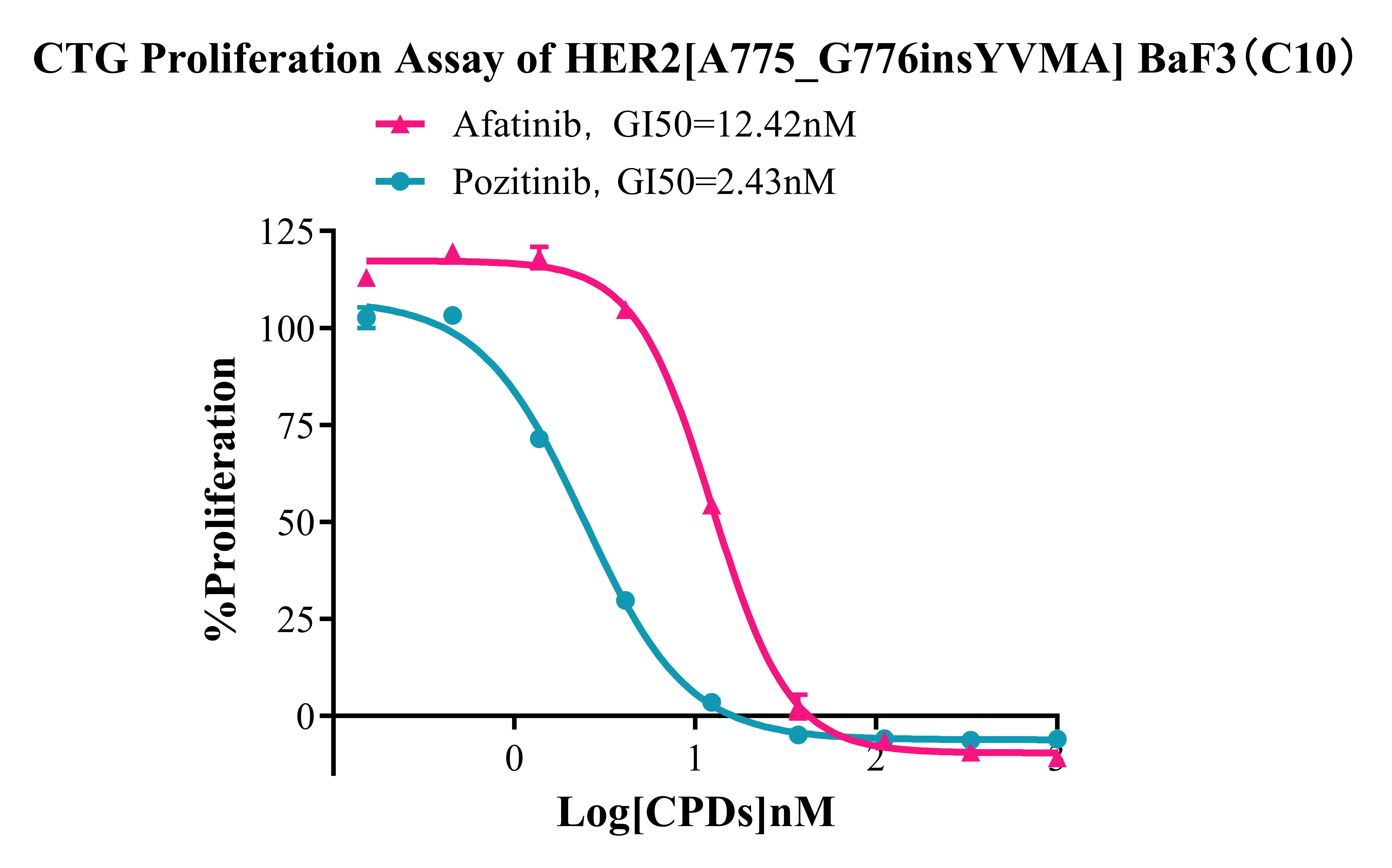 HER2[A775_G776insYVMA] BaF3 藥靶細(xì)胞,通過轉(zhuǎn)導(dǎo)突變狀態(tài)的 HER2[A775_G776insYVMA] 基 因 到 BaF3 細(xì) 胞 系 中 , 穩(wěn) 定 表 達(dá)人突變形態(tài)下的 HER2[A775_G776insYVMA] 基因。