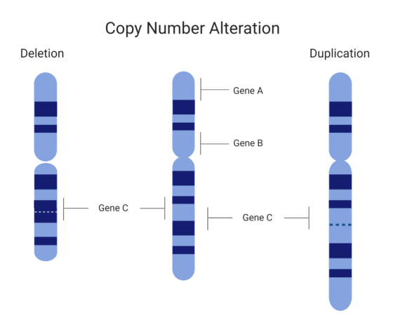 | 染色體片段位置的改變稱為易位(translocation)。它伴有基因位置的改變。易位發(fā)生在一條染色體內(nèi)時稱為移位或染色體內(nèi)易位;易位發(fā)生在兩條同源或非同源染色體之間時稱為染色體間易位。 查看更多 | 拷貝數(shù)變異(Copy number variation, CNV)是由基因組發(fā)生重排而導致的,一般指長度為1 kb以上的基因組大片段的拷貝數(shù)增加或者減少,主要表現(xiàn)為亞顯微水平的缺失和重復。 查看更多 | |
