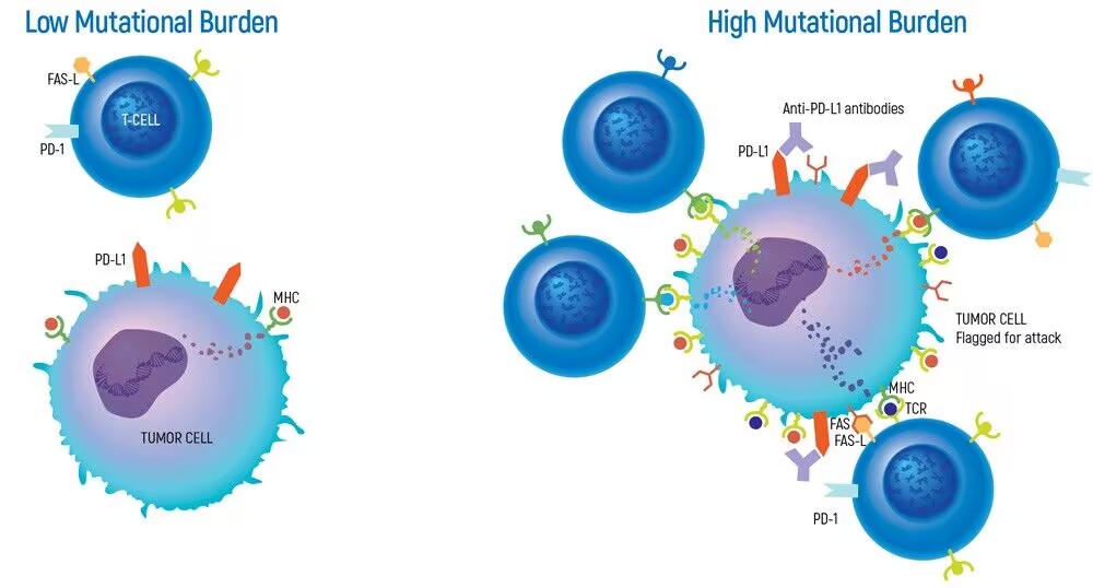 | 腫瘤突變負(fù)荷(tumor mutational burden, TMB)即腫瘤基因組編碼區(qū)包含的非同義突變的數(shù)量或密度(突變數(shù)/Mb), 是腫瘤新抗原負(fù)荷的替代指標(biāo), 過去以全外顯子組測序(whole-exome sequencing, WES)作為評估的金標(biāo)準(zhǔn)。 查看更多 | MSI,即微衛(wèi)星不穩(wěn)定性,是指DNA復(fù)制過程中,錯配修復(fù)機制(DNA mismatch repair, MMR)失靈,致使重復(fù)片段增加或減少無法被機體修復(fù),引起微衛(wèi)星長度變化的現(xiàn)象。 查看更多 | |