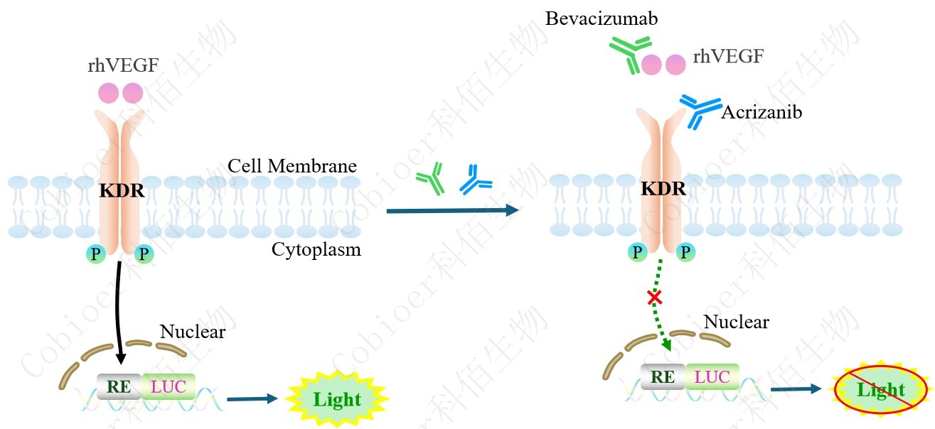 VEGF(KDR) Effector Reporter Cell 報(bào)告基因藥靶模型很好的模擬了體內(nèi) VEGF(KDR)的信號(hào)轉(zhuǎn)導(dǎo)過程,原理見下圖所示。