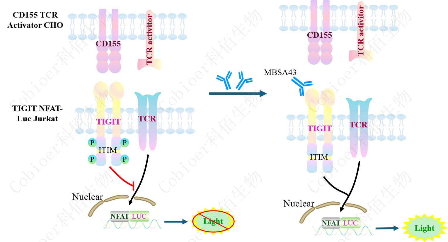 TIGIT NFAT-Luc Jurkat 報告基因藥靶模型很好的模擬了體內(nèi) TIGIT 的信號轉(zhuǎn)導過程, 原理見下圖所示。