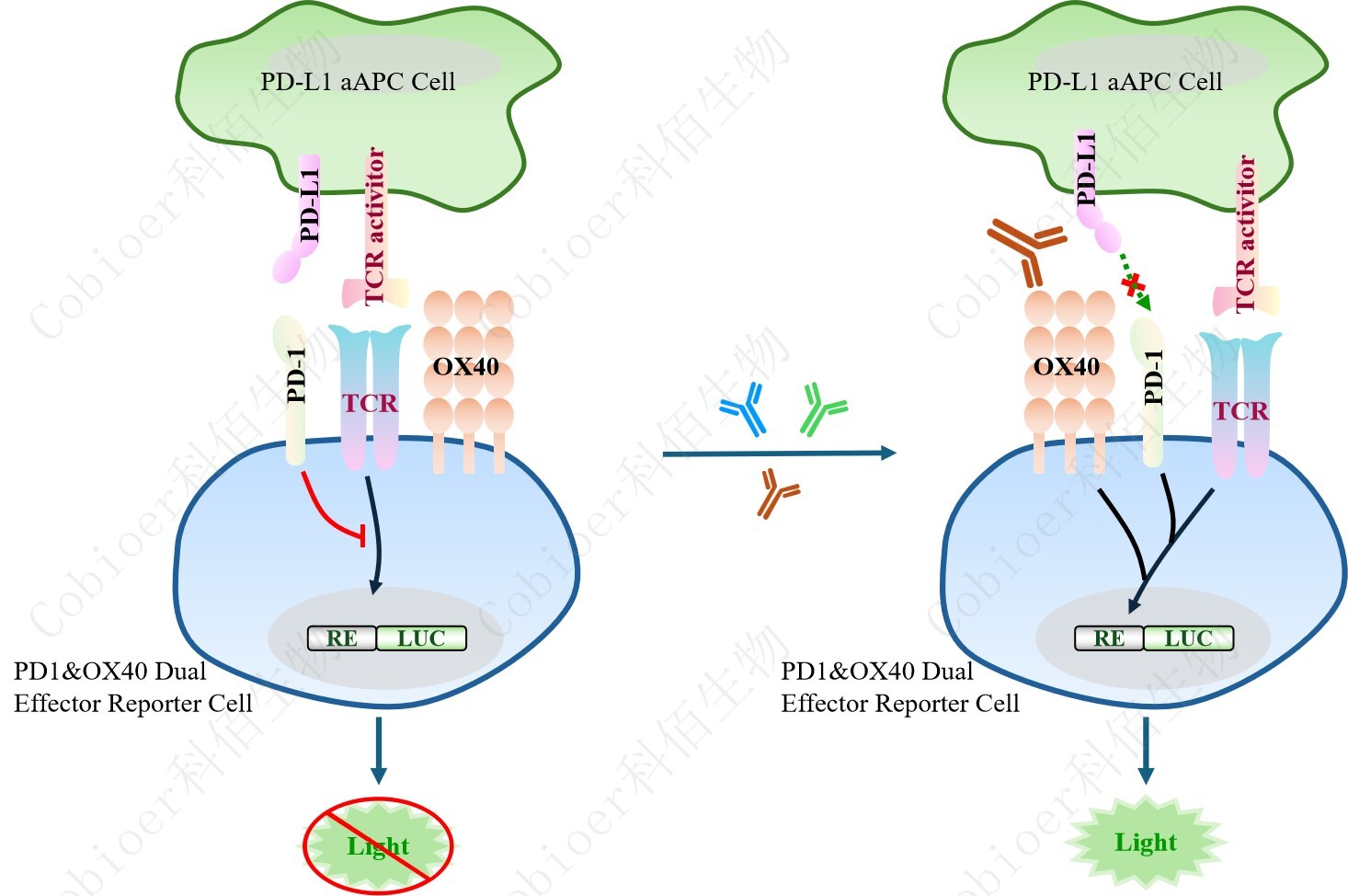 PD1&OX40 Dual Effector Reporter Cell 報告基因藥靶模型很好的模擬了體內 PD1&OX40 的信號轉導過程,原理見下圖所示。