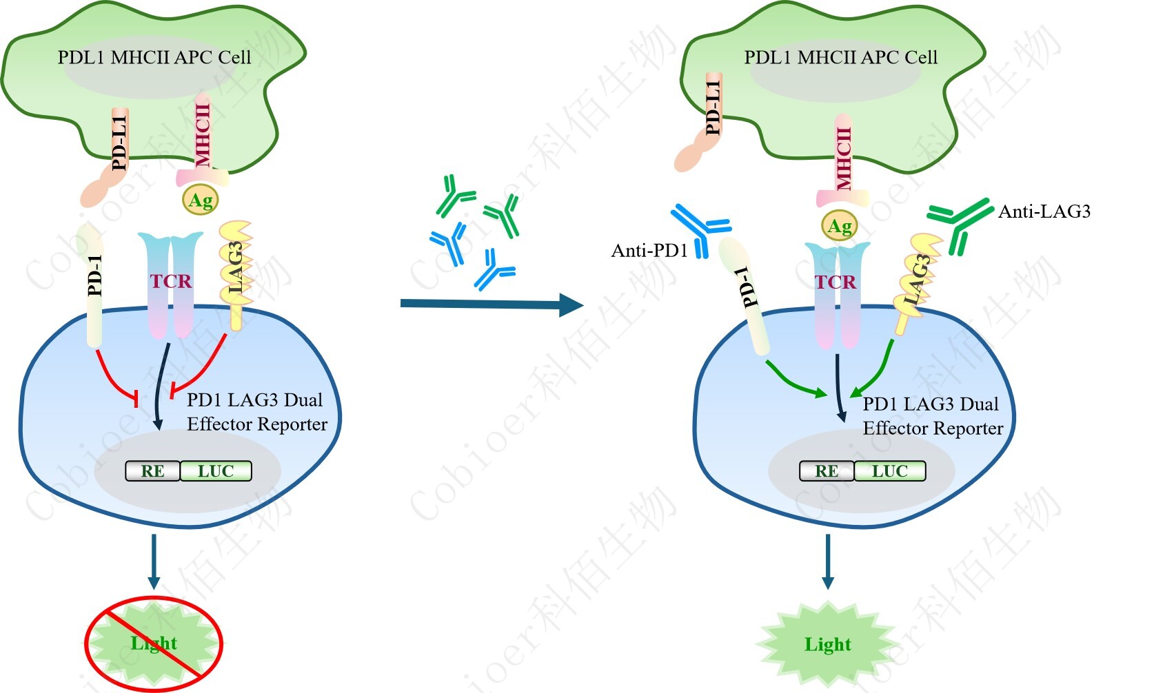 PD1 LAG3 Dual Effector Reporter Cell 報(bào)告基因藥靶模型很好的模擬了體內(nèi) PD1&LAG3 的信號(hào)轉(zhuǎn)導(dǎo)過程,原理見下圖所示。![]() Figure 1. PD1 LAG3 Dual Effector Reporter Cell 細(xì)胞模型原理圖 |