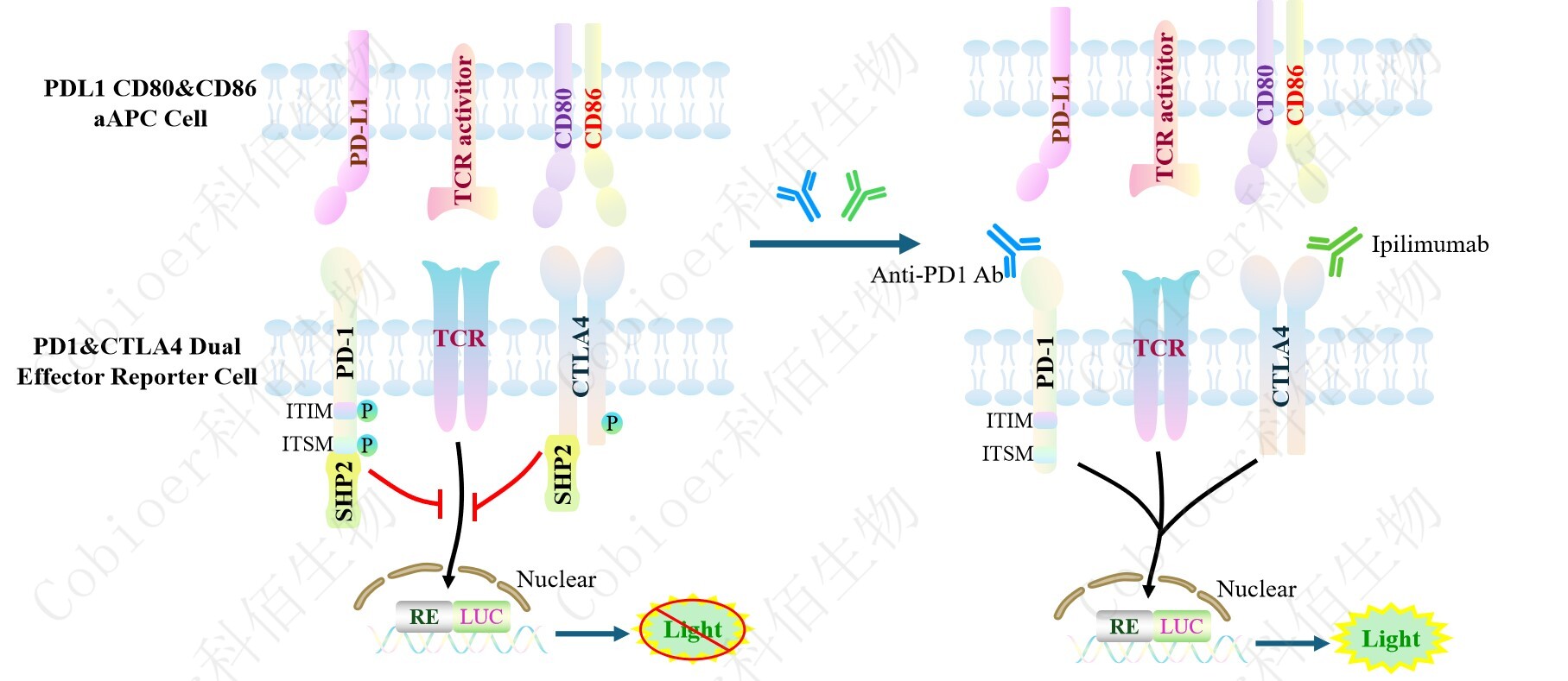 PD1&CTLA4 Dual Effector Reporter Cell 報 告 基 因 藥 靶 模 型 很 好 的 模 擬 了 體 內 PD1&CTLA4 的信號轉導過程,原理見下圖所示。