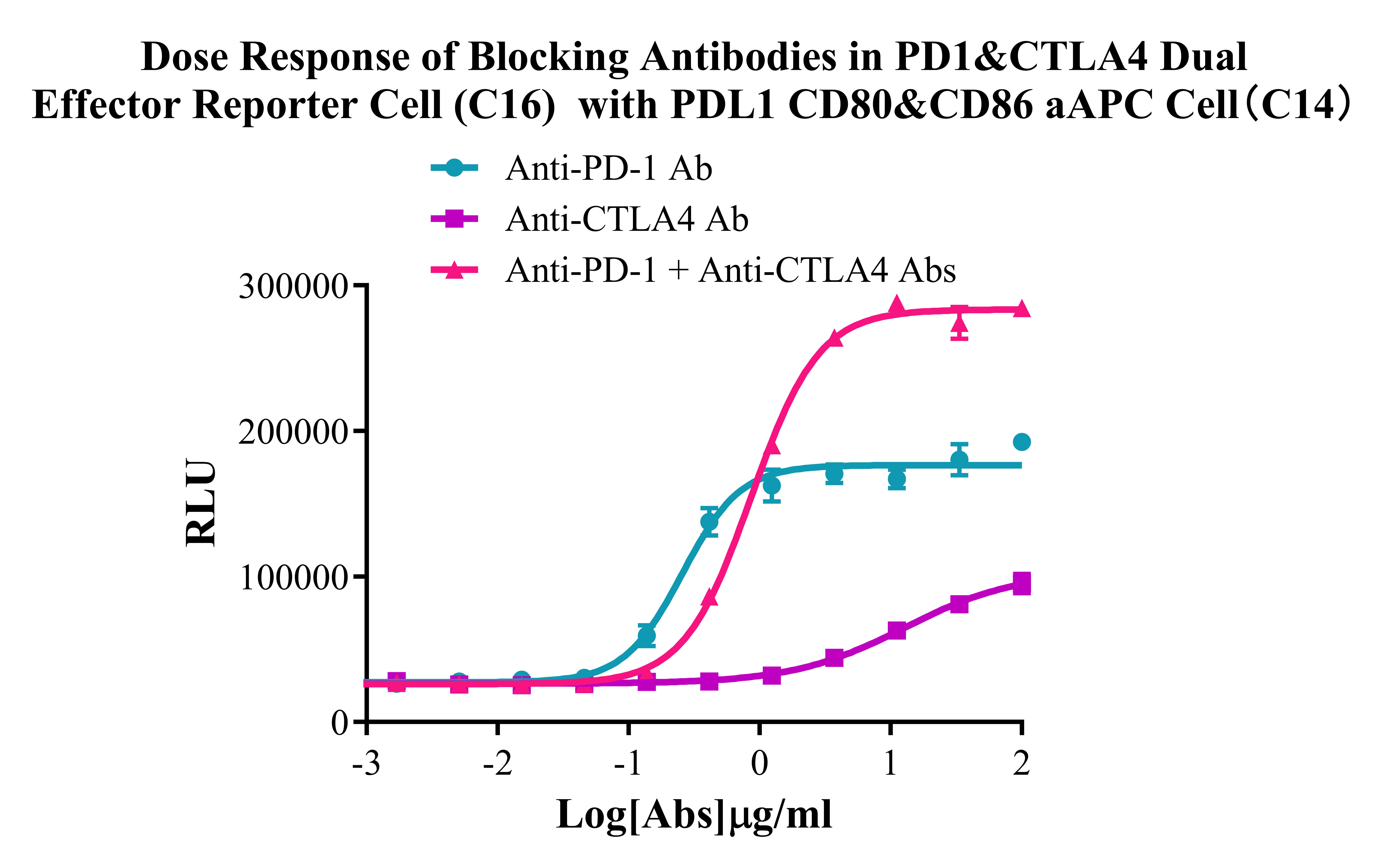 Figure 3. Dose Response of Blocking Antibodies in PD1/CTLA4 Dual Effector Reporter Cell (C16) With PDL1 CD80&CD86 aAPC Cell(C14). |
