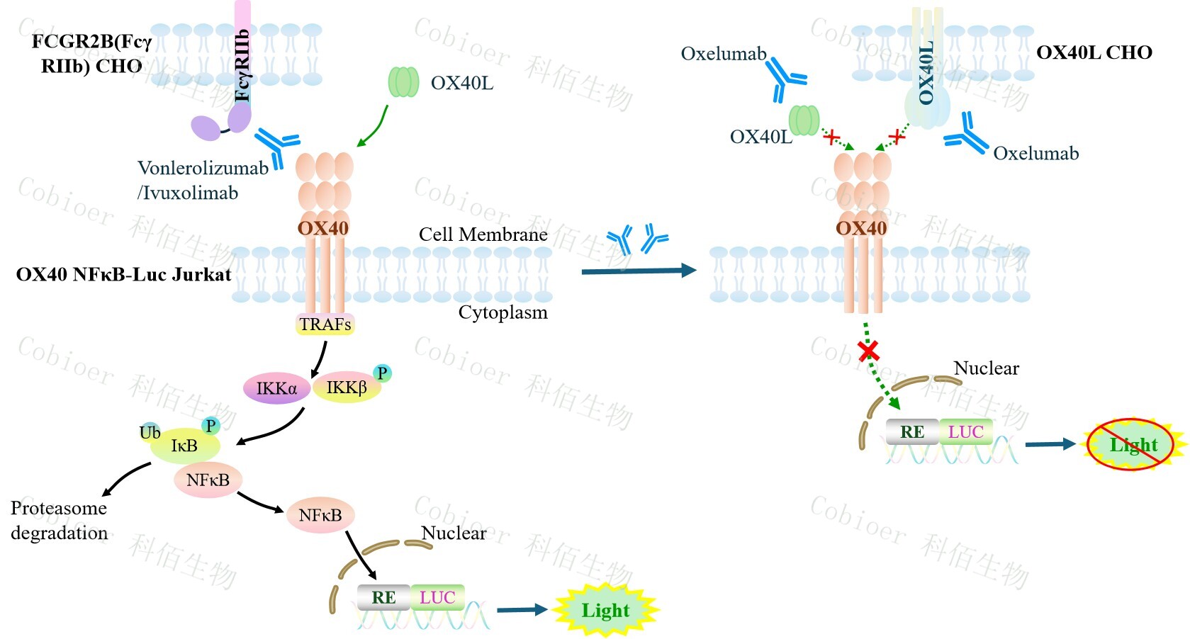 OX40 NFκB-Luc Jurkat 報(bào)告基因藥靶模型很好的模擬了體內(nèi) OX40 的信號(hào)轉(zhuǎn)導(dǎo)過程,原理見下圖所示。
