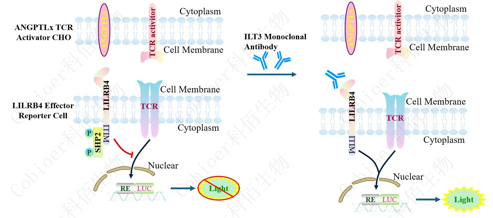 LILRB4 Effector Reporter Cell 報告基因藥靶模型很好的模擬了體內(nèi) LILRB4 的信號轉(zhuǎn) 導過程,原理見下圖所示。![]() ![]() Figure 1. LILRB4 Effector Reporter Cell 模型原理圖