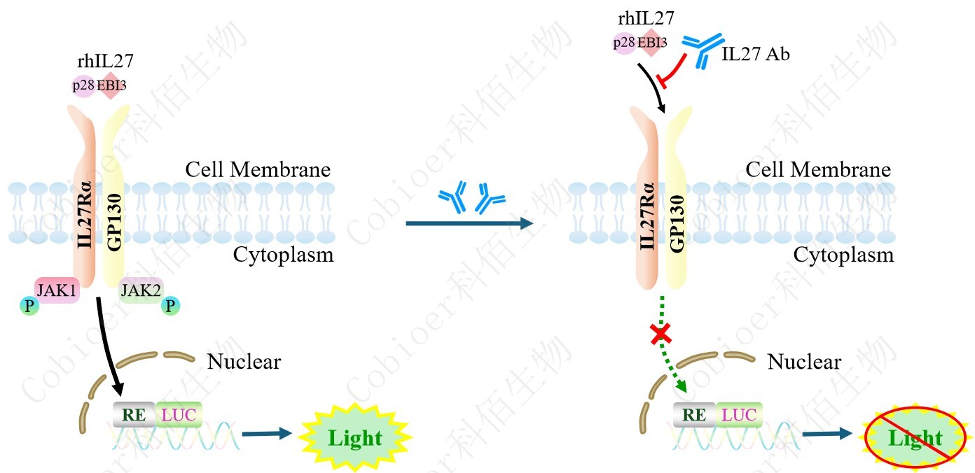 IL27 Effector Reporter Cell 報告基因藥靶模型很好的模擬了體內(nèi) IL27 的信號轉(zhuǎn)導(dǎo)過程, 原理見下圖所示。![]() Figure 1. IL27 Effector Reporter Cell 細(xì)胞模型原理圖 |