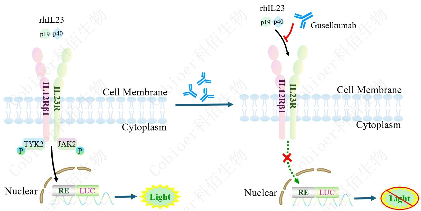 IL23 Effector Reporter Cell 報(bào)告基因藥靶模型很好的模擬了體內(nèi) IL23 的信號(hào)轉(zhuǎn)導(dǎo)過(guò)程, 原理見(jiàn)下圖所示。 ![]() Figure 1. IL23 Effector Reporter Cell 細(xì)胞模型原理圖