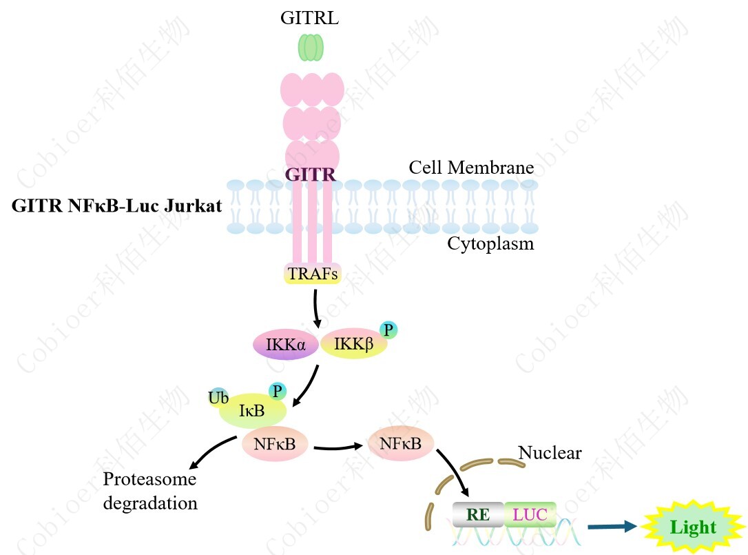 GITR NFκB-Luc Jurkat 報(bào)告基因藥靶模型很好的模擬了體內(nèi) GITR 的信號(hào)轉(zhuǎn)導(dǎo)過(guò)程, 原理見(jiàn)下圖所示。![]() Figure 1. GITR NFκB-Luc Jurkat 細(xì)胞模型原理圖