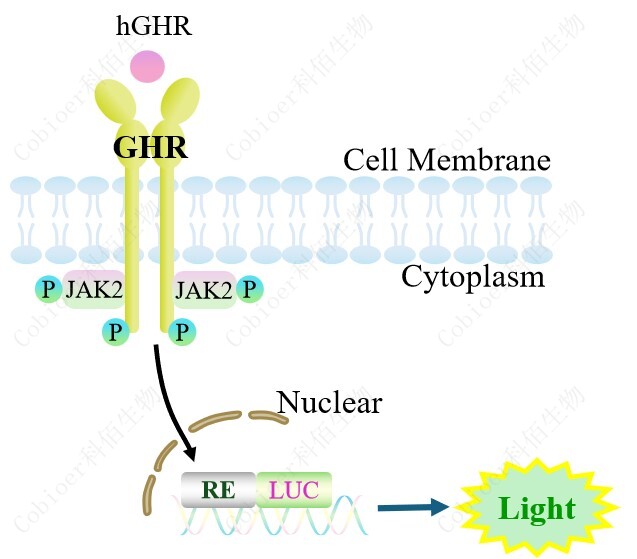 GHR Effector Reporter Cell 報告基因藥靶模型很好的模擬了體內(nèi) GHR 的信號轉(zhuǎn)導(dǎo)過程, 原理見下圖所示。![]() Figure 1. : GHR Effector Reporter Cell 細(xì)胞模型原理圖 |
