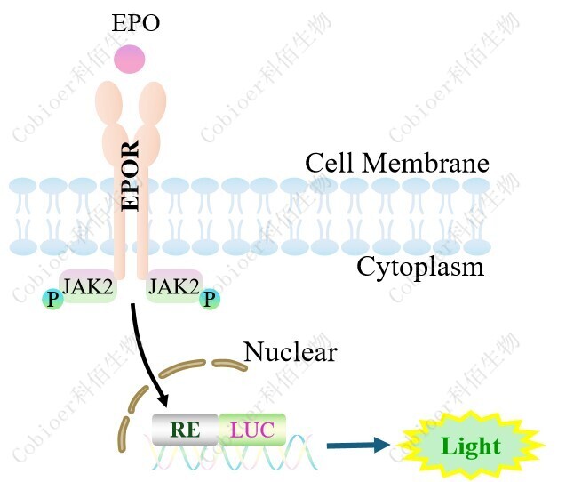 EPO Effector Reporter Cell 報告基因藥靶模型很好的模擬了體內(nèi) EPO&EPOR 的信號轉(zhuǎn) 導(dǎo)過程,原理見下圖所示。![]() Figure 1. EPO Effector Reporter Cell 細(xì)胞模型原理圖 |