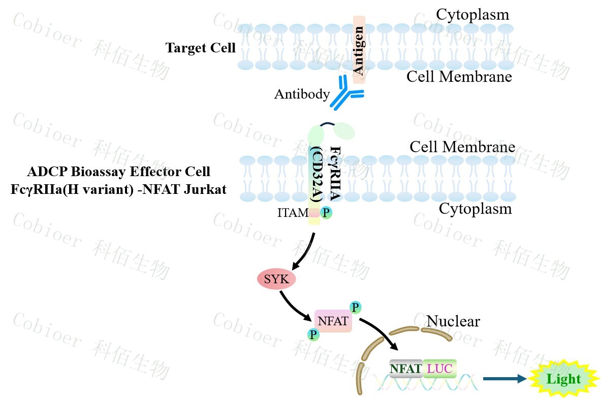 Figure 1. ADCP Bioassay Effector Cell FcγRIIa(H variant) -NFAT Jurkat 細(xì)胞模型原理圖