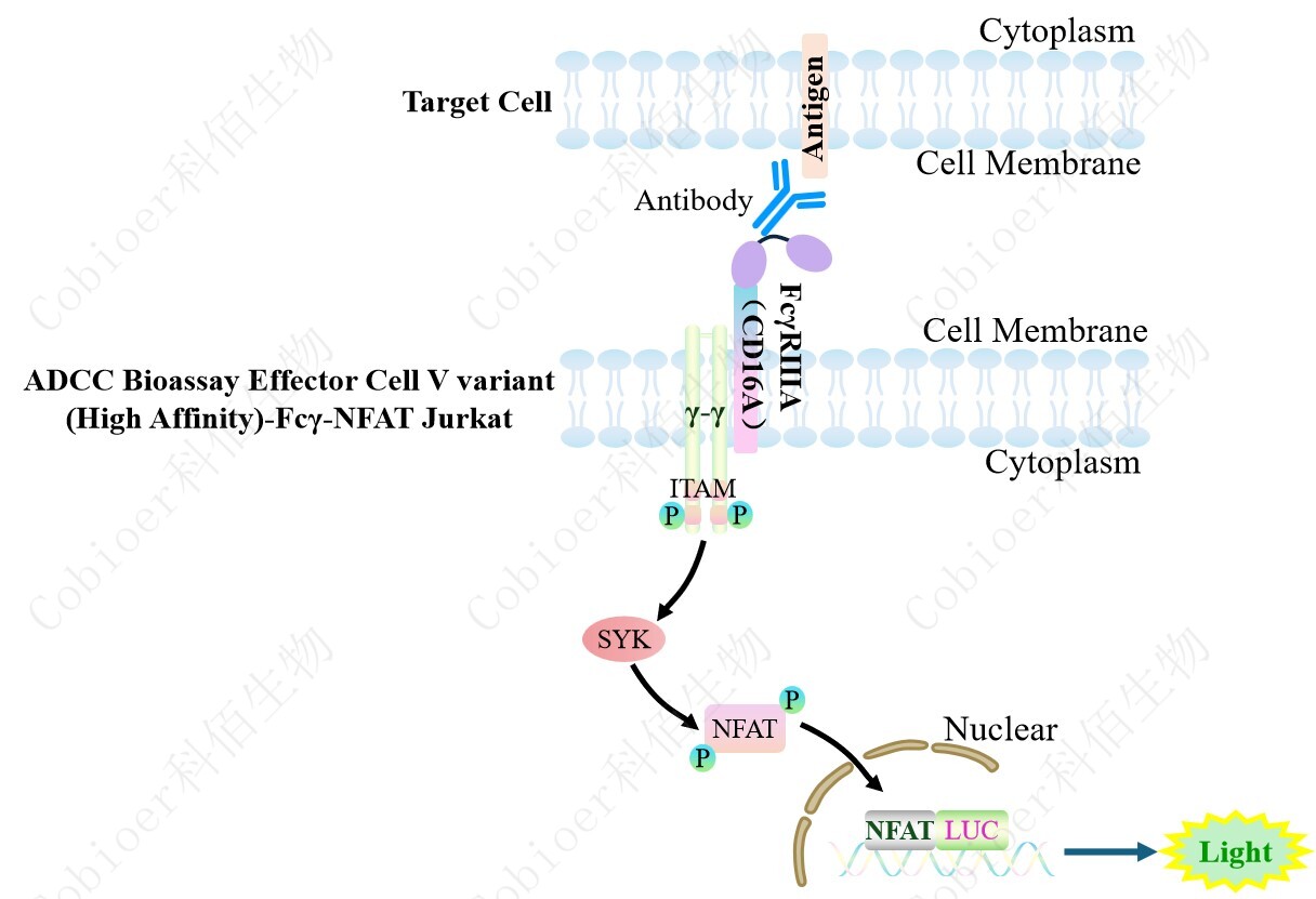 ADCC Bioassay Effector Cell V variant (High Affinity)-Fcγ-NFAT Jurkat 報(bào)告基因藥靶模 型很好的模擬了體內(nèi) ADCC 的信號(hào)轉(zhuǎn)導(dǎo)過(guò)程,原理見(jiàn)下圖所示。
