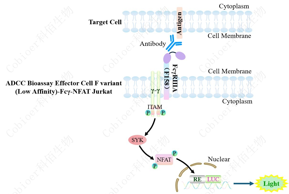 ADCC Bioassay Effector Cell F variant (Low Affinity)-Fcγ-NFAT Jurkat 報告基因藥靶模型 很好的模擬了體內 ADCC 的信號轉導過程,原理見下圖所示。