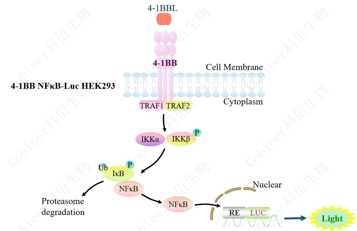 4-1BB NFκB-Luc HEK293 報(bào)告基因藥靶模型很好的模擬了體內(nèi) 4-1BB 的信號(hào)轉(zhuǎn)導(dǎo)過(guò)程, 原理見(jiàn)下圖所示。 Figure 1. 4-1BB NFκB-Luc HEK293 細(xì)胞模型原理圖