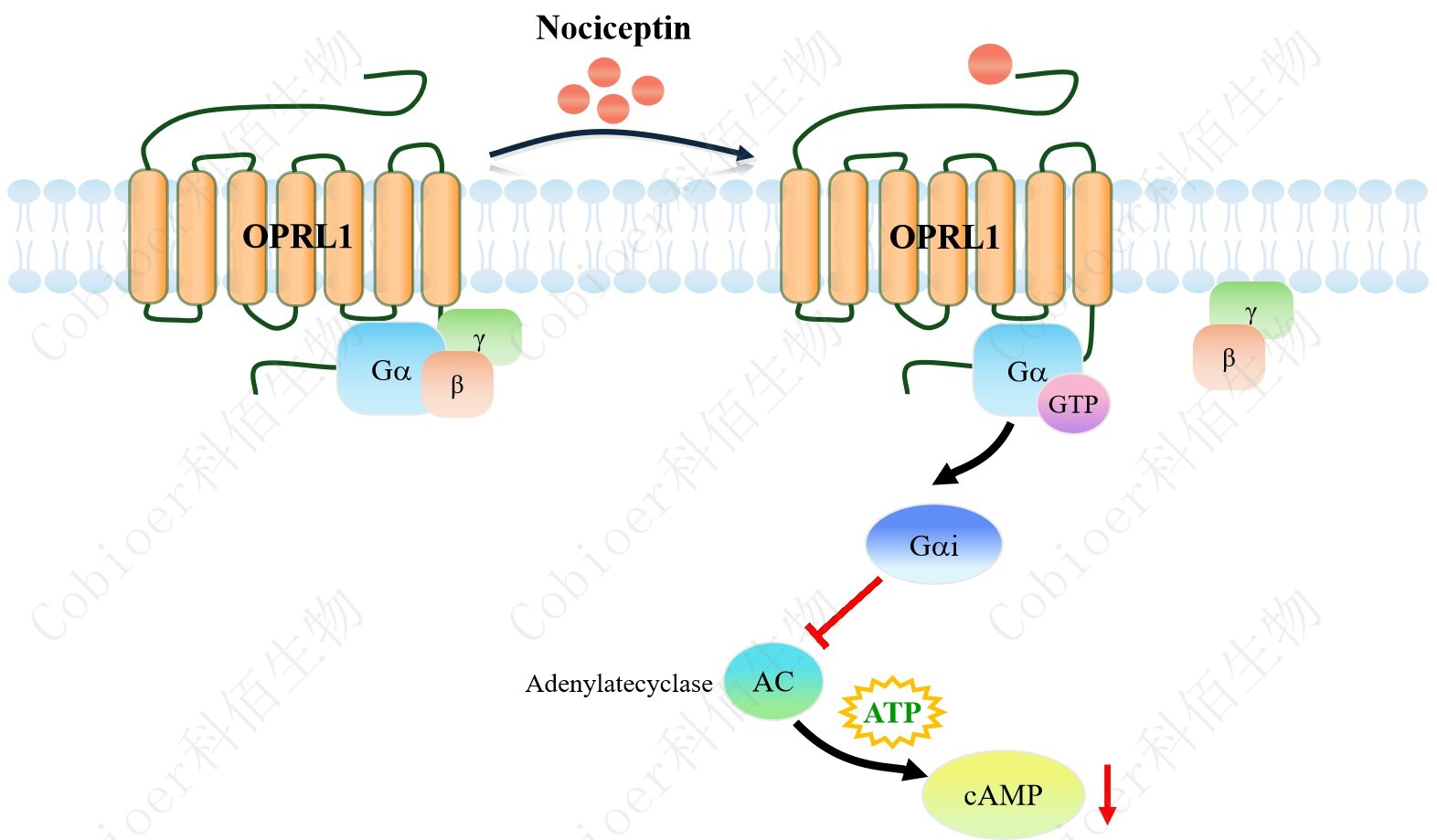 阿片受體家族包括κ-阿片受體(KOP)、 δ-阿片受體(DOP)、µ-阿片受體(MOP) 和痛覺肽阿片受體(NOP),均屬于 G 蛋白偶聯(lián)受體,主要通過偶聯(lián)下游 Gi 蛋白發(fā)揮功 能。NOP 也被稱為痛覺肽/孤兒蛋白 FQ (N/OFQ)受體或 kappa- 3 型阿片受體,是一種由 OPRL1 基因編碼的蛋白質(zhì)。痛覺肽受體是 G 蛋白偶聯(lián)受體阿片亞家族的一員,其天然配體 是 17 個氨基酸的神經(jīng)肽,稱為痛覺肽(N/OFQ)。阿片相關(guān)痛覺肽受體 1 (OPRL1)廣泛表達 于中樞神經(jīng)系統(tǒng),包括海馬齒狀回、皮質(zhì)區(qū)、紋狀體、丘腦和下丘腦。 |