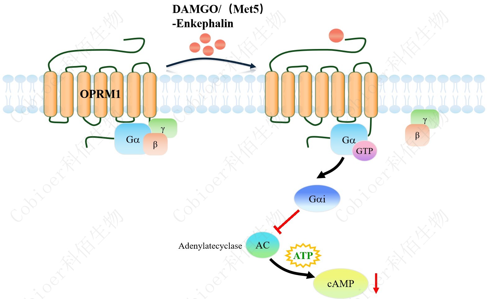 cAMP 在 G 蛋白偶聯(lián)受體(GPCR)信號轉(zhuǎn)導中是一種關鍵的第二信使。當配體結(jié)合到 GPCR,構(gòu)象發(fā)生變化,激活受體接著激活 G 蛋白,Gi 的激活導致腺苷酸環(huán)化酶調(diào)控 cAMP 的下調(diào)。OPRM1 CHO 藥靶模型很好的模擬了體內(nèi) OPRM1 的信號轉(zhuǎn)導過程,原理見 下圖所示。 |