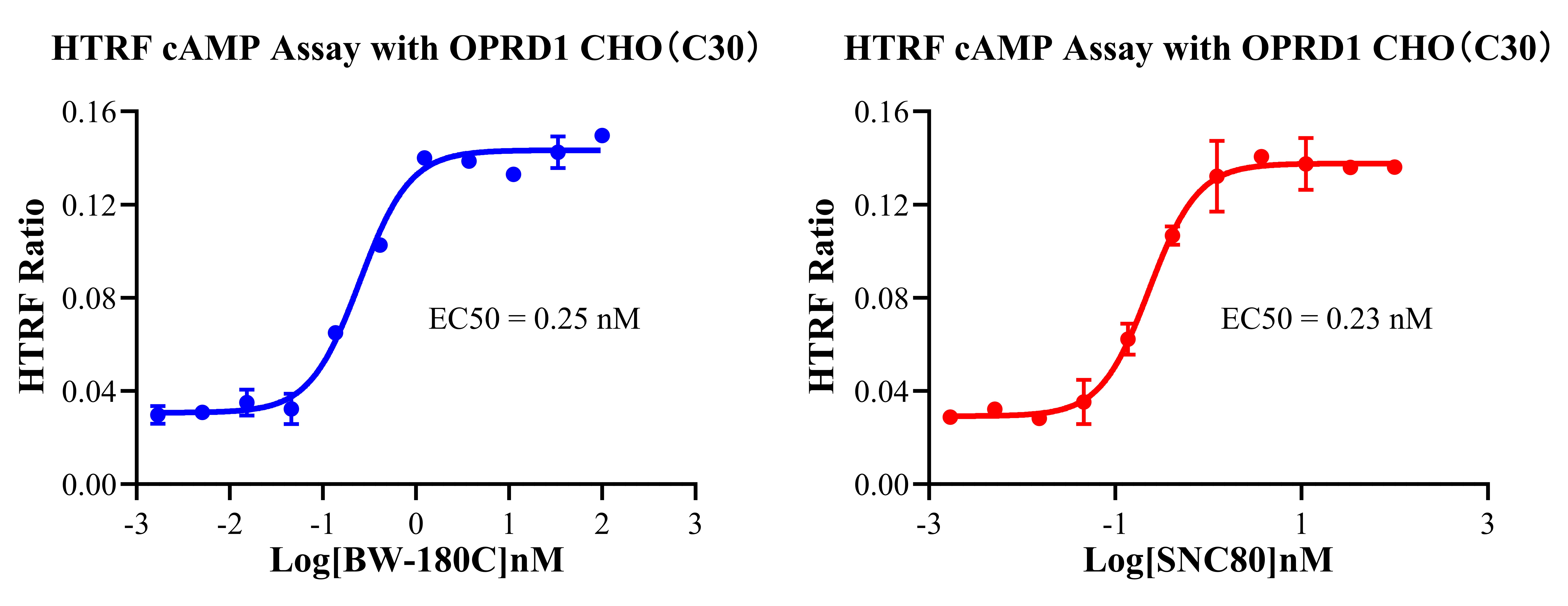 cAMP 在 G 蛋白偶聯(lián)受體(GPCR)信號轉(zhuǎn)導中是一種關(guān)鍵的第二信使。當配體結(jié)合到 GPCR,構(gòu)象發(fā)生變化,激活受體接著激活 G 蛋白,Gi 的激活導致腺苷酸環(huán)化酶調(diào)控 cAMP 的下調(diào)。OPRD1 CHO 藥靶模型很好的模擬了體內(nèi) OPRD1 的信號轉(zhuǎn)導過程,原理見下圖所示。 |