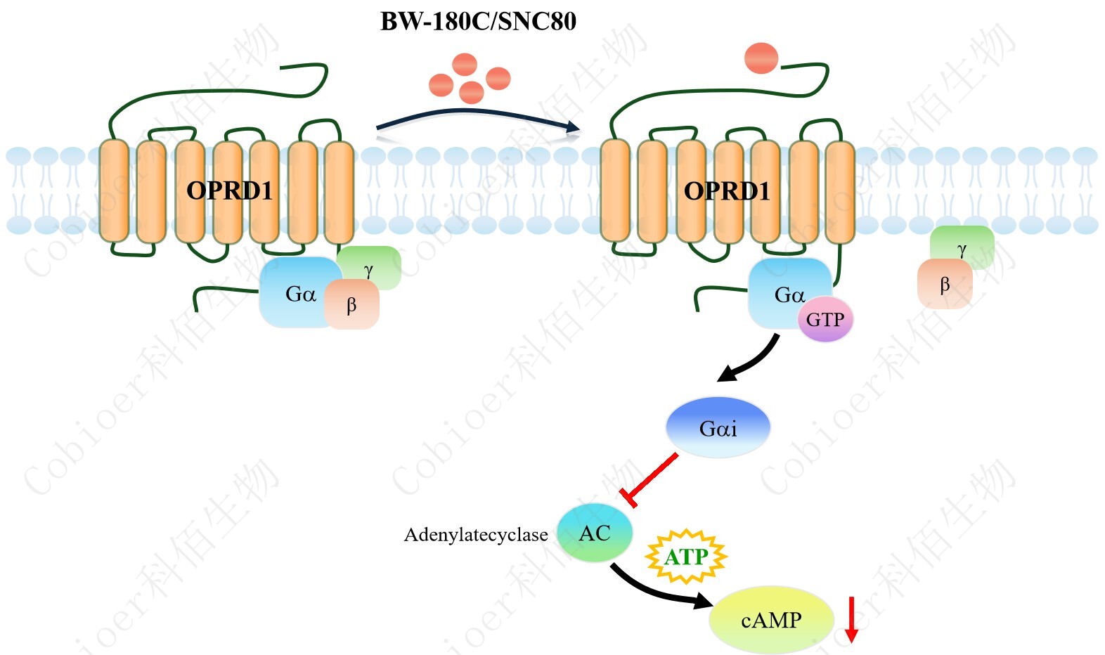 阿片受體家族包括κ-阿片受體(KOP)、 δ-阿片受體(DOP)、µ-阿片受體(MOP) 和痛覺肽阿片受體(NOP),均屬于 G 蛋白偶聯(lián)受體,主要通過偶聯(lián)下游 Gi 蛋白發(fā)揮功 能。OPRD1 是一種 G 蛋白偶聯(lián)受體,作為內(nèi)源性腦啡肽和其他阿片亞群的受體。配體結(jié)合 引起構(gòu)象改變,通過鳥嘌呤核苷酸結(jié)合蛋白(G 蛋白)觸發(fā)信號,并調(diào)節(jié)下游效應物(如腺苷 酸環(huán)化酶)的活性。信號傳導導致腺苷酸環(huán)化酶活性的抑制。它通過減少鈣離子電流和增加 鉀離子電導來抑制神經(jīng)遞質(zhì)釋放。它在疼痛的感知和阿片介導的鎮(zhèn)痛中起作用。 |