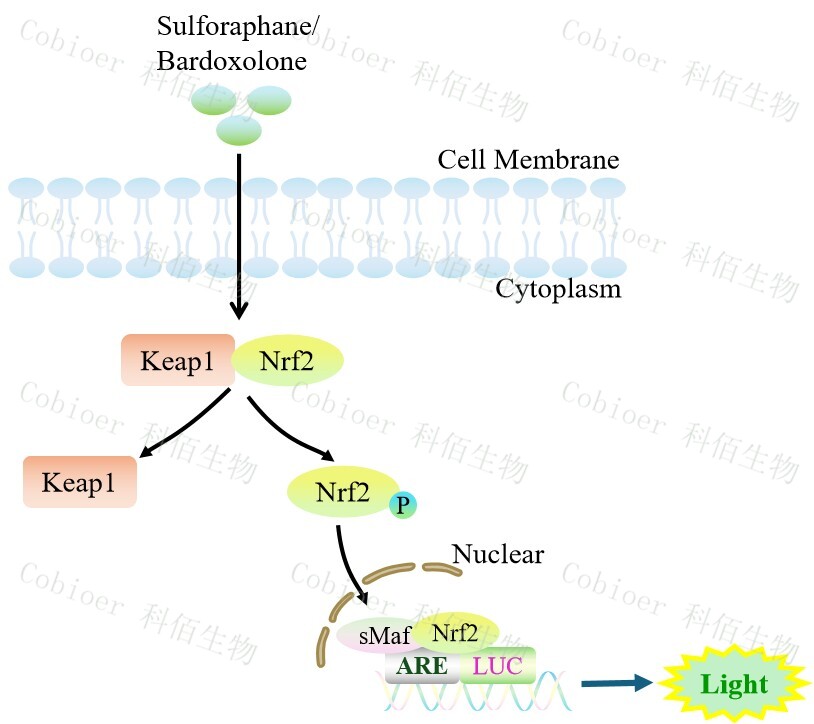 ARE-Luc MCF7 報告基因細胞,是由 ARE 調(diào)控并表達 Luc 熒光素酶報 告基因的 MCF7 細胞。Sulforaphane 是 Keap1/Nrf2/ARE 的誘導劑,Bardoxolone 是 NRf2 的 激活劑,原原理見下圖所示。![]() |
