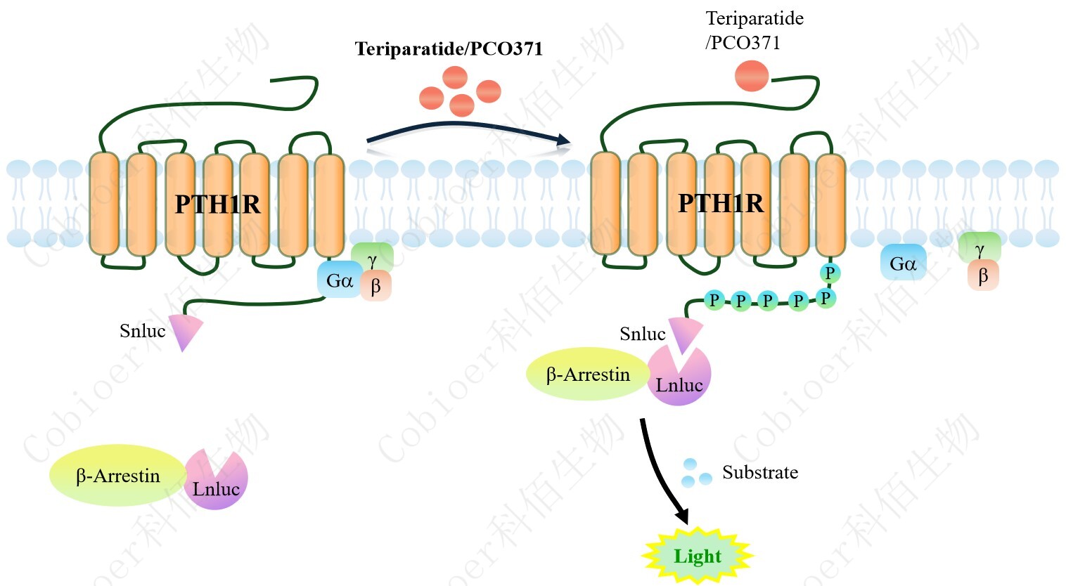 PTH1R β-Arrestin CHO PTH1R β-Arrestin CHO 報告基因藥靶模型很好的模擬了體內(nèi) PTH1R/β-Arrestin 的信號 轉(zhuǎn)導過程,原理見下圖所示。當缺乏配體刺激時,β-Arrestin 不與 PTH1R 結(jié)合,融合β- Arrestin 的熒光素酶處于失活構(gòu)象,當 PTH1R 遭遇配體刺激時,融合熒光素酶報告基因的 β-Arrestin 被招募,使熒光素酶報告基因處于激活狀態(tài),加入其底物后發(fā)光信號增強。 ![]() Figure 1. PTH1R β-Arrestin CHO 細胞模型原理圖 |