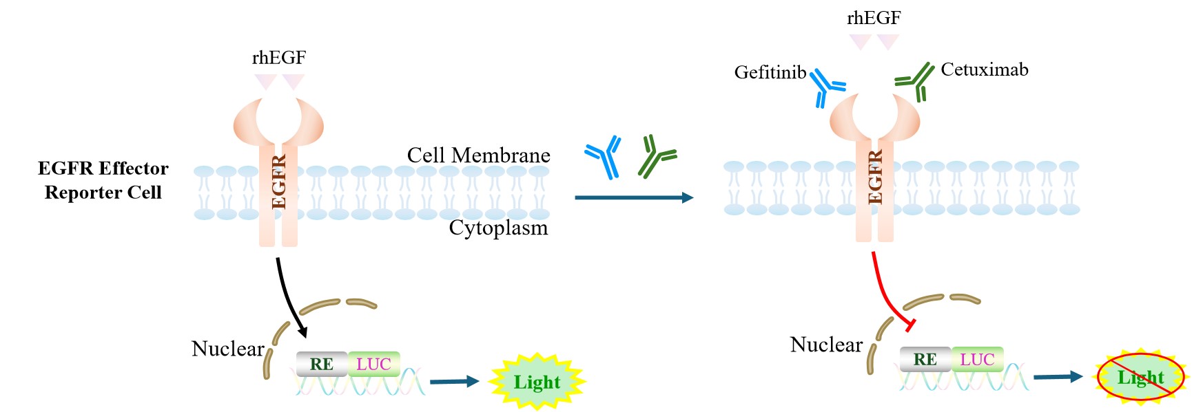 EGFR Effector Reporter Cell 報告基因藥靶模型很好的模擬了體內(nèi) EGFR 的信號轉(zhuǎn)導過程, 原理見下圖所示。