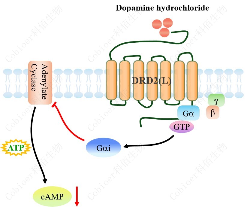 cAMP 在 G 蛋白偶聯(lián)受體(GPCR)信號(hào)轉(zhuǎn)導(dǎo)中是一種關(guān)鍵的第二信使。當(dāng)配體結(jié)合 到 GPCR,構(gòu)象發(fā)生變化,激活受體接著激活 G 蛋白,Gi 的激活導(dǎo)致腺苷酸環(huán)化酶調(diào)控 cAMP 的下調(diào)。DRD2 (L) HEK293 藥靶模型很好的模擬了體內(nèi) DRD2 的信號(hào)轉(zhuǎn)導(dǎo)過(guò)程,原理見(jiàn)下圖所示。
