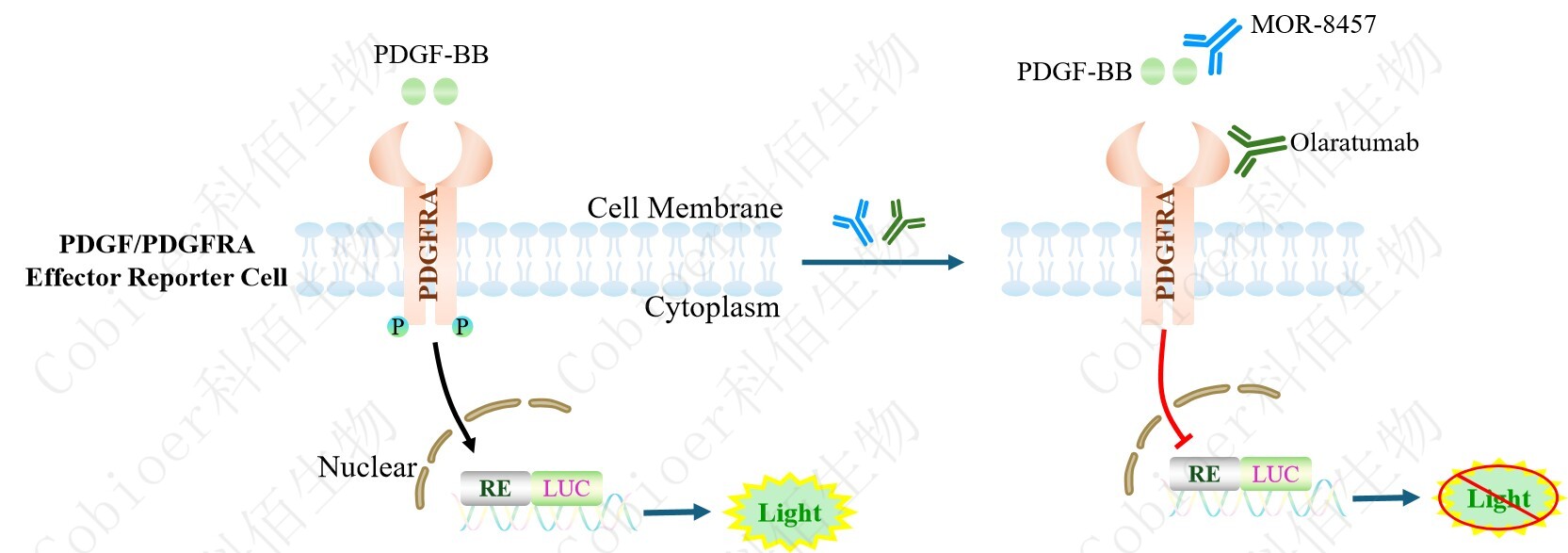 PDGF/PDGFRA Effector Reporter Cell 報告基因藥靶模型很好的模擬了體內(nèi) PDGFRA 的信號轉導過程,原理見下圖所示。