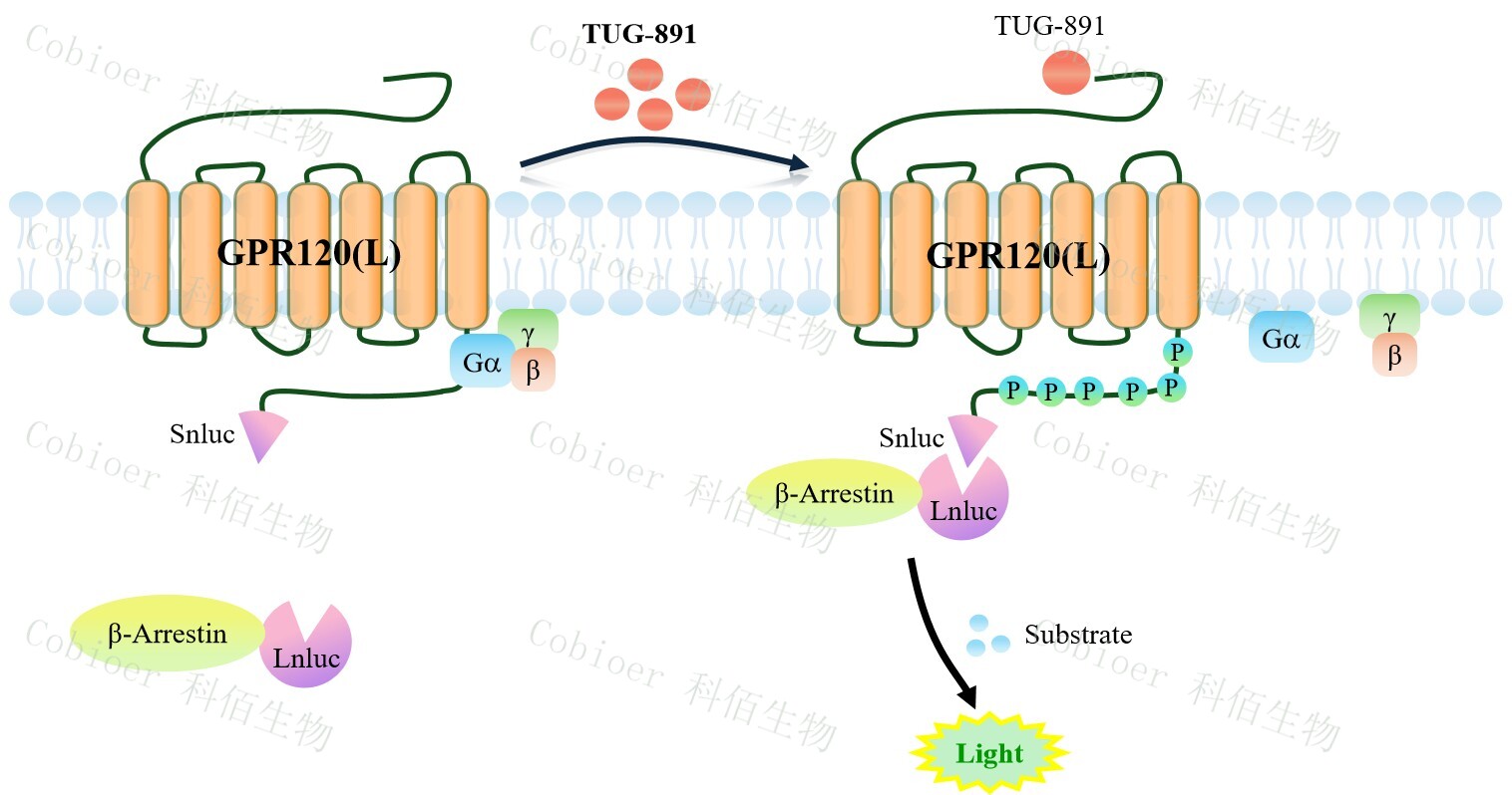 GPR120(L) β-Arrestin CHO 報告基因藥靶模型很好的模擬了體內(nèi) GPR120(L)/β-Arrestin 的信號轉(zhuǎn)導(dǎo)過程,原理見圖 1 所示。當缺乏配體刺激時,β-Arrestin 不與 GPR120(L)結(jié)合, 融合β-Arrestin 的熒光素酶處于失活構(gòu)象,當 GPR120(L)遭遇配體刺激時,融合熒光素酶報 告基因的β-Arrestin 被招募,使熒光素酶報告基因處于激活狀態(tài),加入其底物后發(fā)光信號增 強。![]() Figure 1. GPR120(L) β-Arrestin CHO 細胞模型原理圖 |