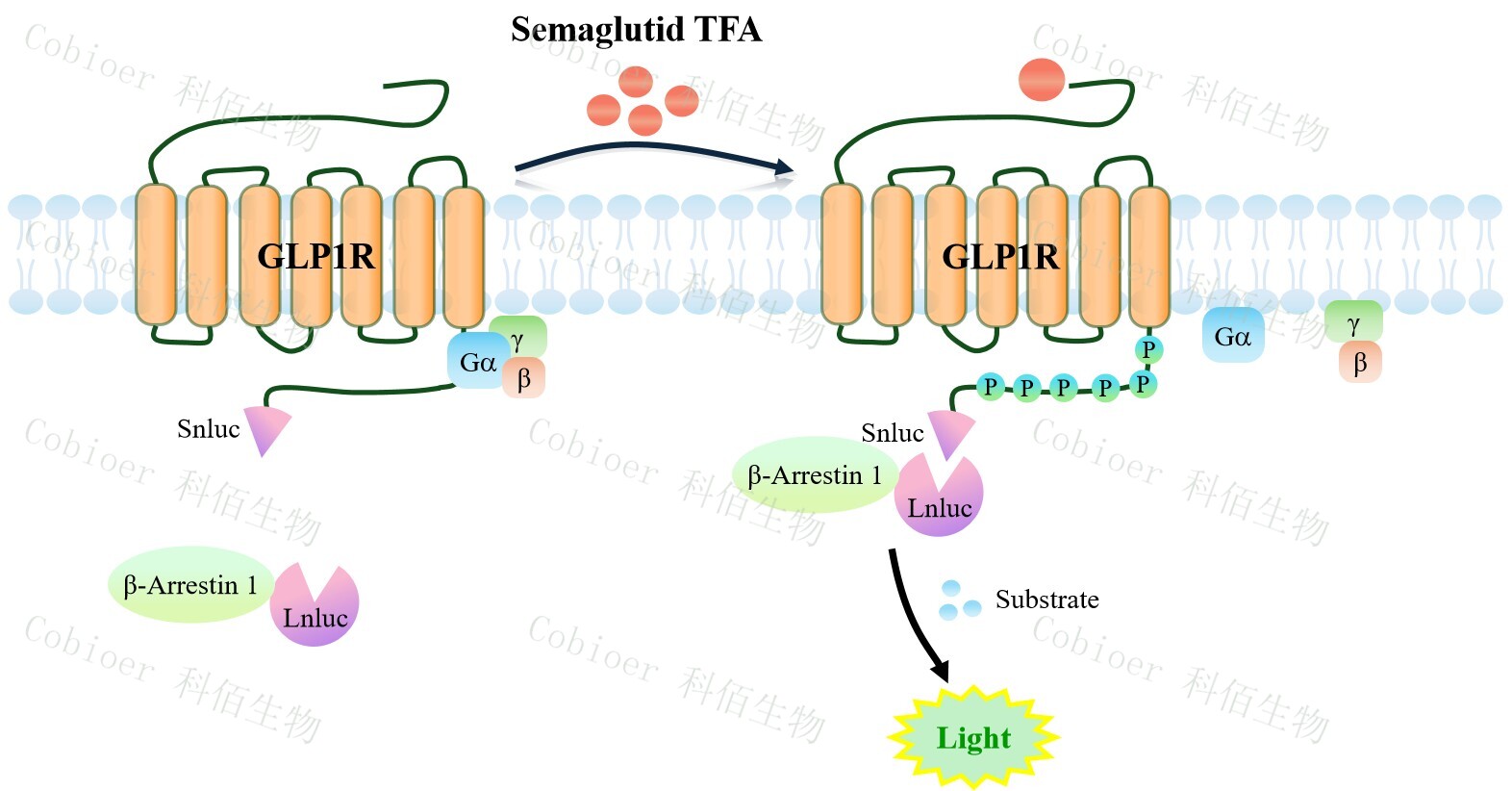 GLP1R β-Arrestin 1 CHO 報告基因藥靶模型很好的模擬了體內(nèi) GLP1R/β-Arrestin 1 的信 號轉(zhuǎn)導過程,原理見下圖所示。當缺乏配體刺激時,β-Arrestin 1 不與 GLP1R 結(jié)合,融合β- Arrestin 1 的熒光素酶處于失活構(gòu)象,當 GLP1R 遭遇配體刺激時,融合熒光素酶報告基因 的β-Arrestin 1 被招募,使熒光素酶報告基因處于激活狀態(tài),加入其底物后發(fā)光信號增強。![]() Figure 1. GLP1R β-Arrestin 1 CHO 細胞模型原理圖 |