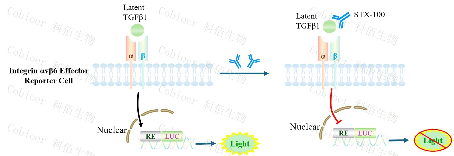 Integrin αvβ6 Effector Reporter Cell 報告基因藥靶模型很好的模擬了體內αvβ6 的信號轉 導過程,原理見下圖所示。