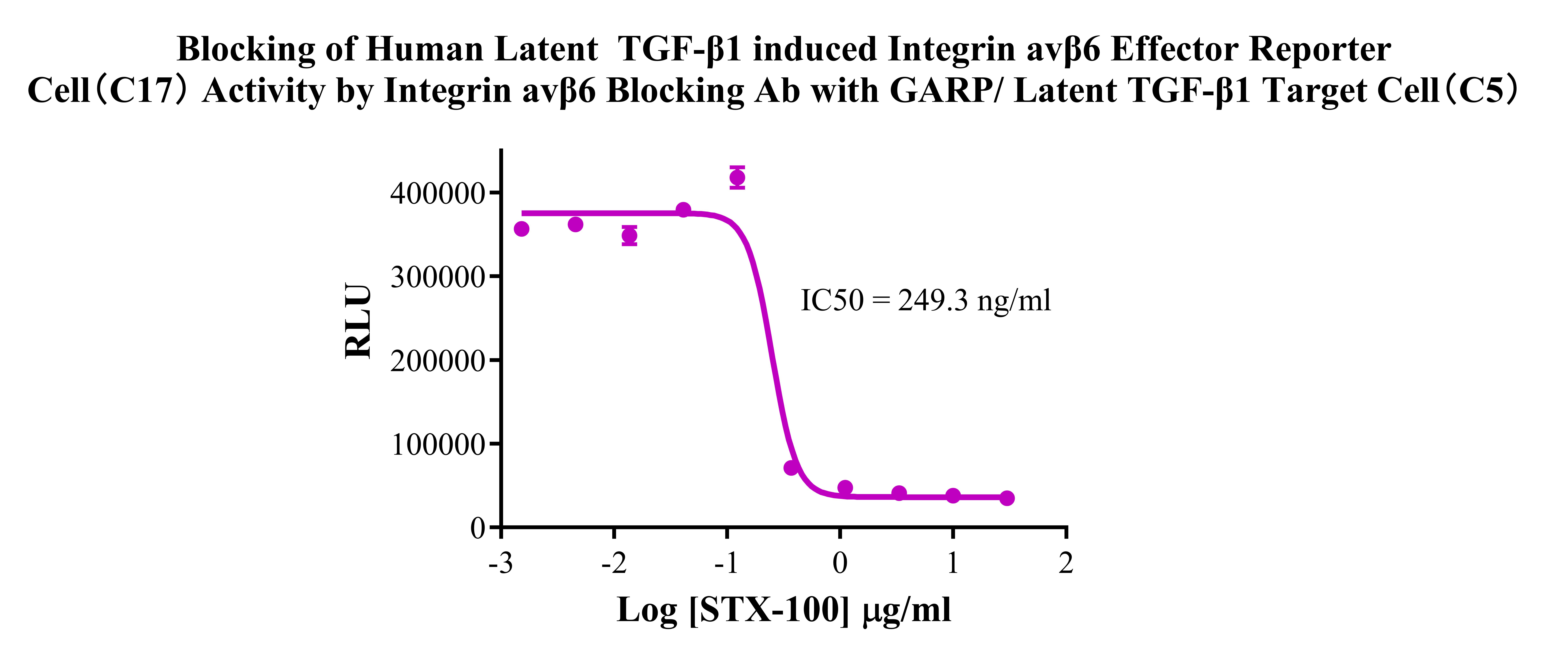 IV. Representative Data![]() Figure 2. Recombinant Integrin avβ6 Effector Reporter Cell stably expressing ITGB6&ITGAV. ![]() Figure 3. Dose Response of Recombinant Human Latent TGFβ1 in Integrin avβ6 Effector Reporter Cell (C17). ![]() Figure 4. Inhibition of Human Latent TGFβ1-induced Reporter Activity by Integrin avβ6 Blocking Antibody in Integrin avβ6 Effector Reporter Cell(C17). ![]() |