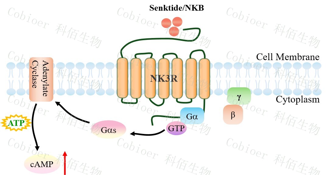 cAMP 在 G 蛋白偶聯(lián)受體(GPCR)信號轉(zhuǎn)導(dǎo)中是一種關(guān)鍵的第二信使。當(dāng)配體結(jié)合 到 GPCR,構(gòu)象發(fā)生變化,激活受體接著激活 G 蛋白,Gs 的激活導(dǎo)致腺苷酸環(huán)化酶調(diào)控 cAMP 的升高。NK3R HEK293 細(xì)胞藥靶模型很好的模擬了體內(nèi) NK3R 的信號轉(zhuǎn)導(dǎo)過程,原 理見下圖所示。