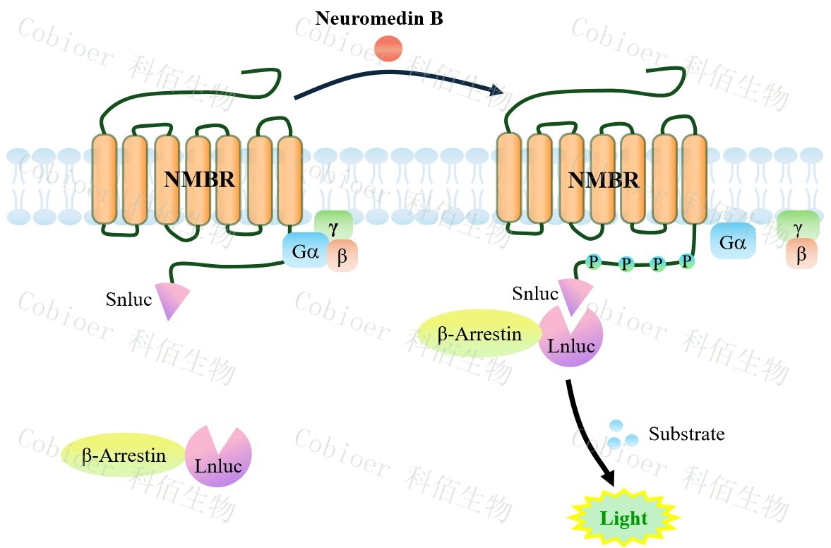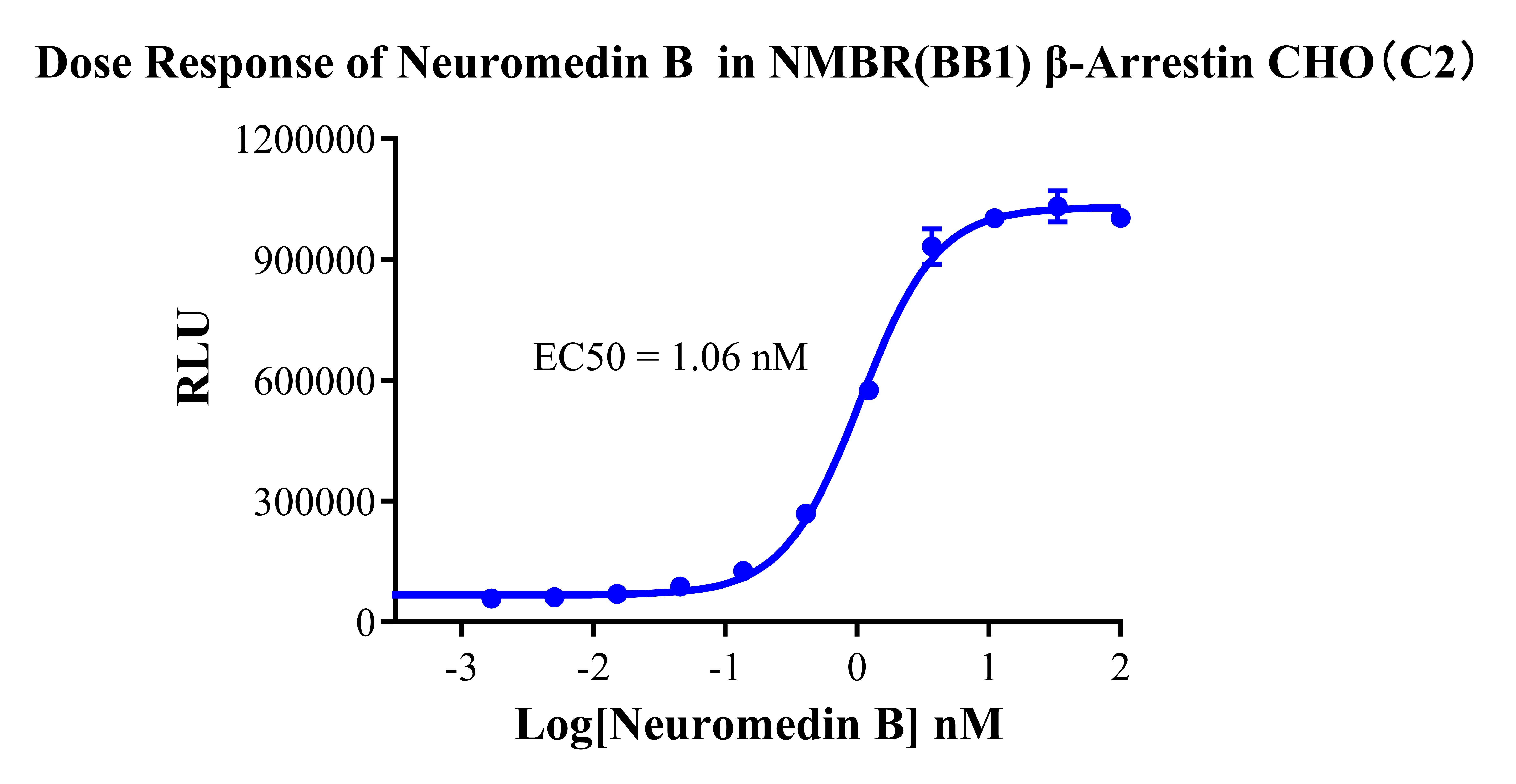 NMBR(BB1) β-Arrestin CHO 報告基因藥靶模型很好的模擬了體內(nèi) NMBR/β-Arrestin 的信號轉(zhuǎn)導過程,原理見下圖所示。當缺乏配體刺激時,β-Arrestin 不與 NMBR 結(jié)合,融合β- Arrestin 的熒光素酶處于失活構(gòu)象,當 NMBR 遭遇配體刺激時,融合熒光素酶報告基因的 β-Arrestin 被招募,使熒光素酶報告基因處于激活狀態(tài),加入其底物后發(fā)光信號增強。![]() Figure 1. NMBR(BB1) β-Arrestin CHO 細胞模型原理圖 |