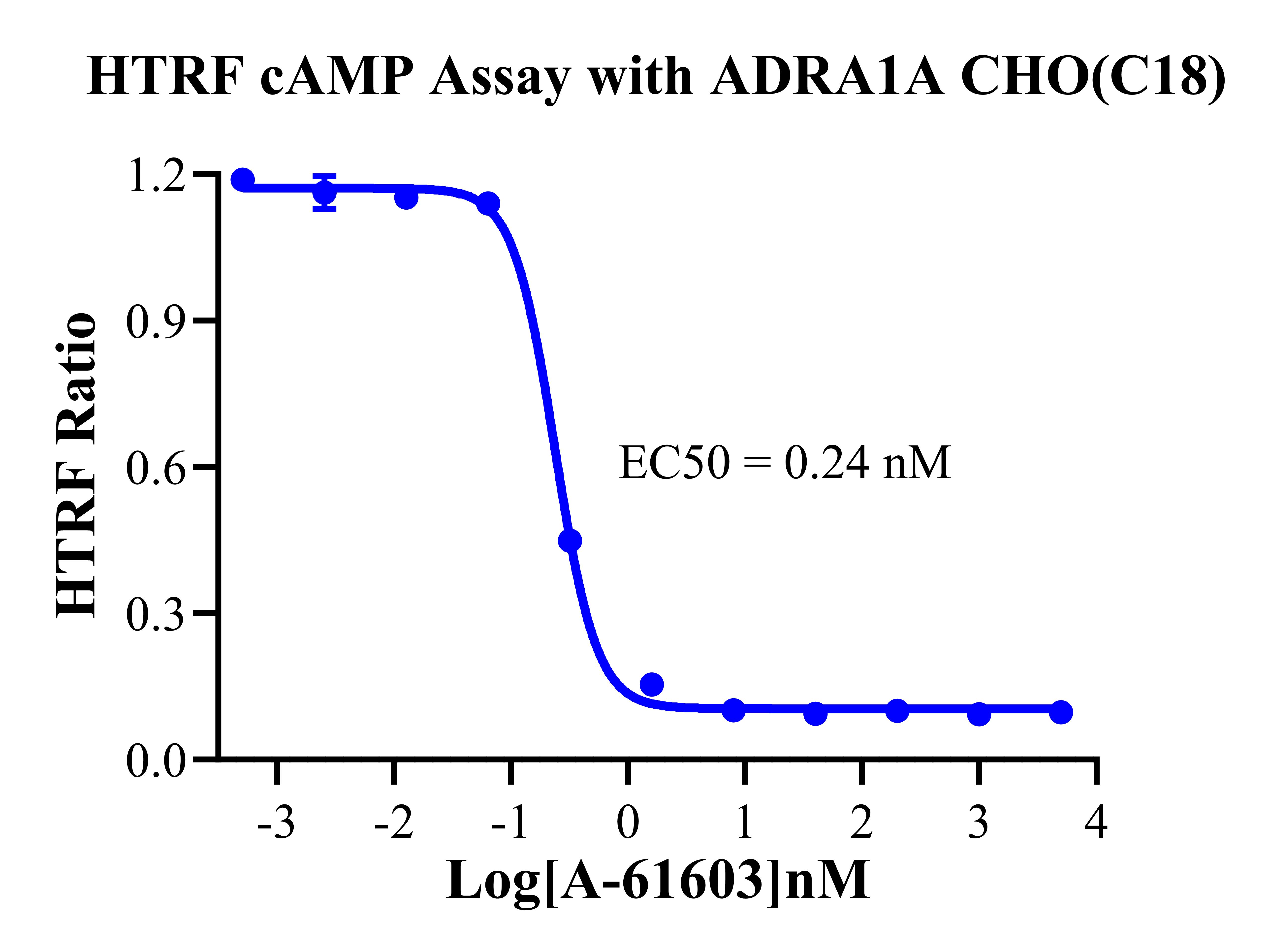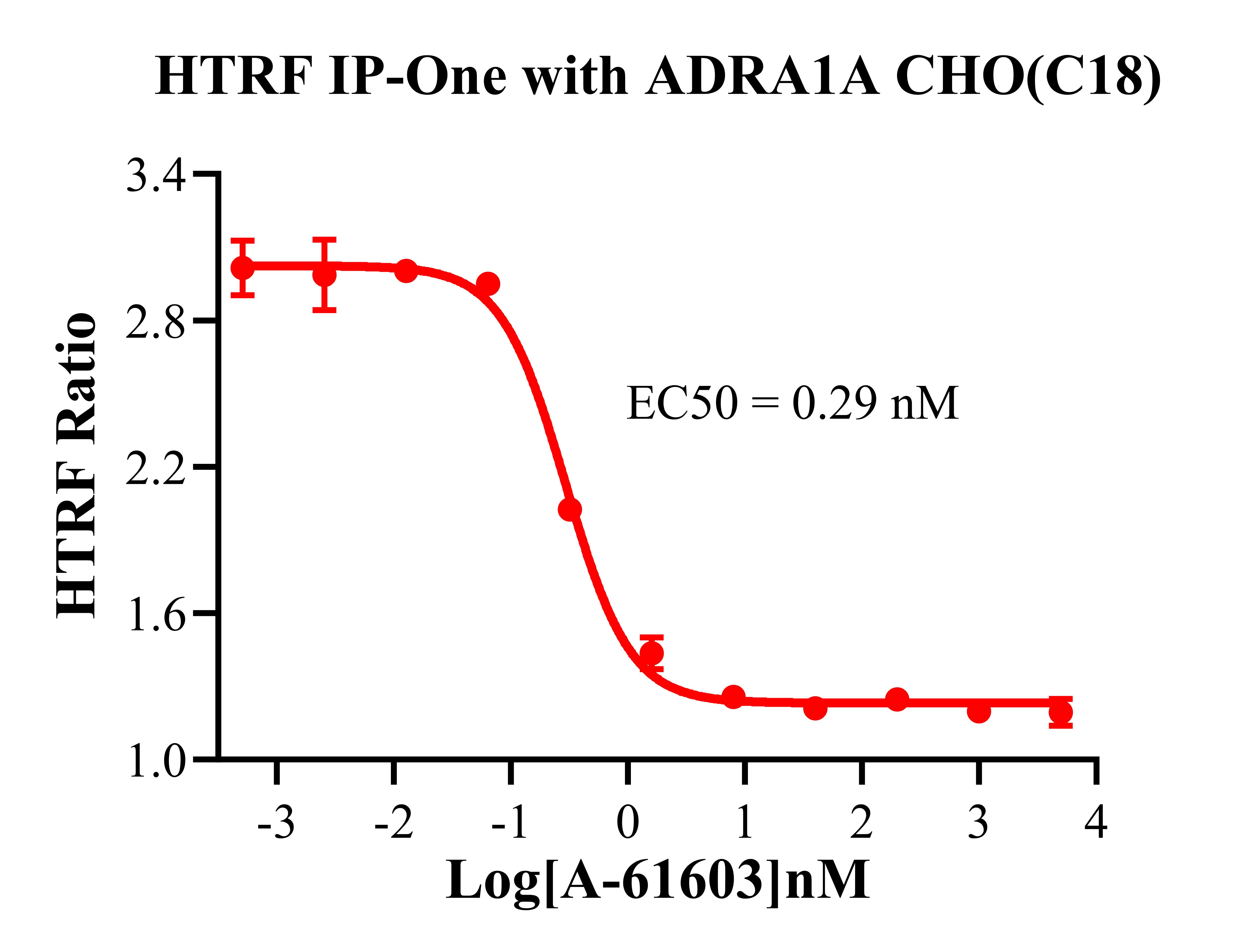 ADRA1A 還可以通過 Gq 蛋白的信號通路,調(diào)控 IP1 的升高。ADRA1A 與配體結(jié)合, 導致 Gαq 亞基的激活,觸發(fā) PLC-γ,從而產(chǎn)生兩個第二信使:IP3 和 DAG,它們參與細胞內(nèi)鈣動員。由于 IP3 在代謝上不穩(wěn)定,因此測量通路激活的替代標志物 IP1 作為檢測標準。