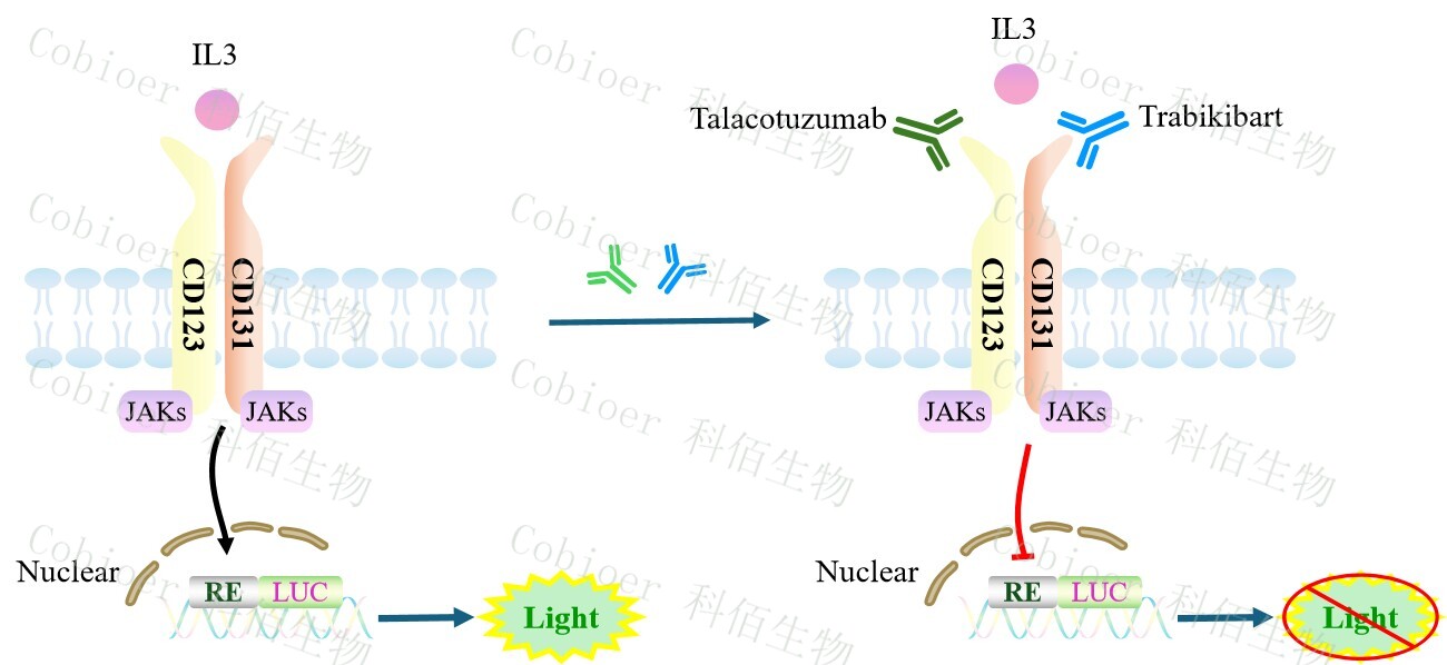IL3 Effector Reporter Cell 報告基因藥靶模型很好的模擬了體內(nèi) IL3 的信號轉(zhuǎn)導(dǎo)過程,原理見下圖所示。![]() Figure 1. IL3 Effector Reporter Cell 細胞模型原理圖 |