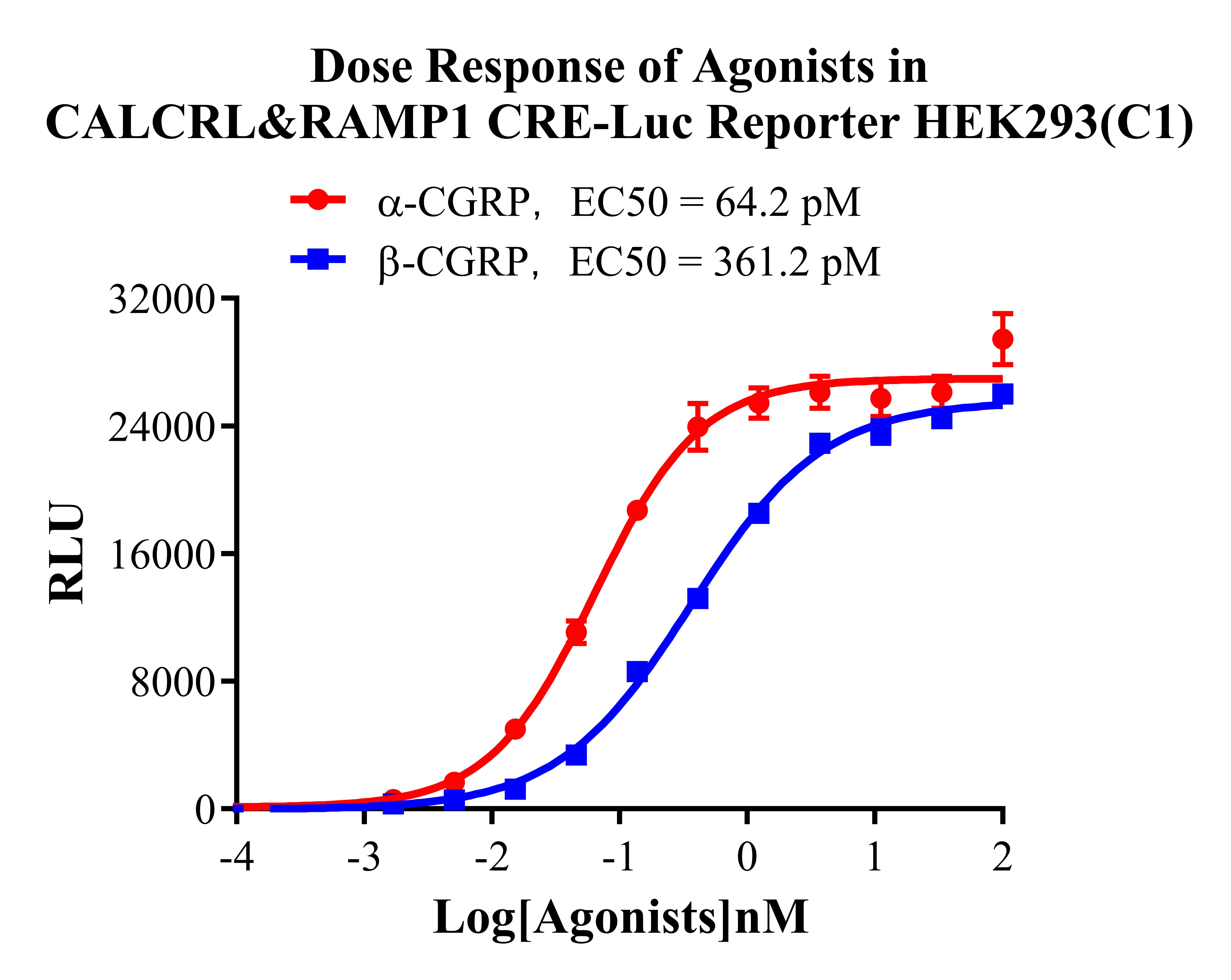 CALCRL&RAMP1 CRE-Luc HEK293 報(bào)告基因藥靶模型很好的模擬了體內(nèi) CGRP 的信 號(hào)轉(zhuǎn)導(dǎo)過程,原理見下圖所示。