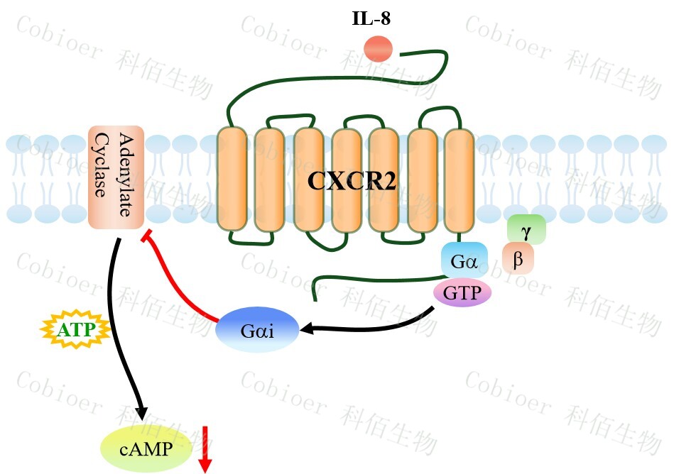 cAMP 在 G 蛋白偶聯(lián)受體(GPCR)信號(hào)轉(zhuǎn)導(dǎo)中是一種關(guān)鍵的第二信使。當(dāng)配體結(jié)合 到 GPCR,構(gòu)象發(fā)生變化,激活受體接著激活 G 蛋白,Gi 的激活導(dǎo)致腺苷酸環(huán)化酶調(diào)控 cAMP 的下調(diào)。CXCR2 CHO 藥靶模型很好的模擬了體內(nèi) CXCR2 的信號(hào)轉(zhuǎn)導(dǎo)過程,原理見 下圖所示。