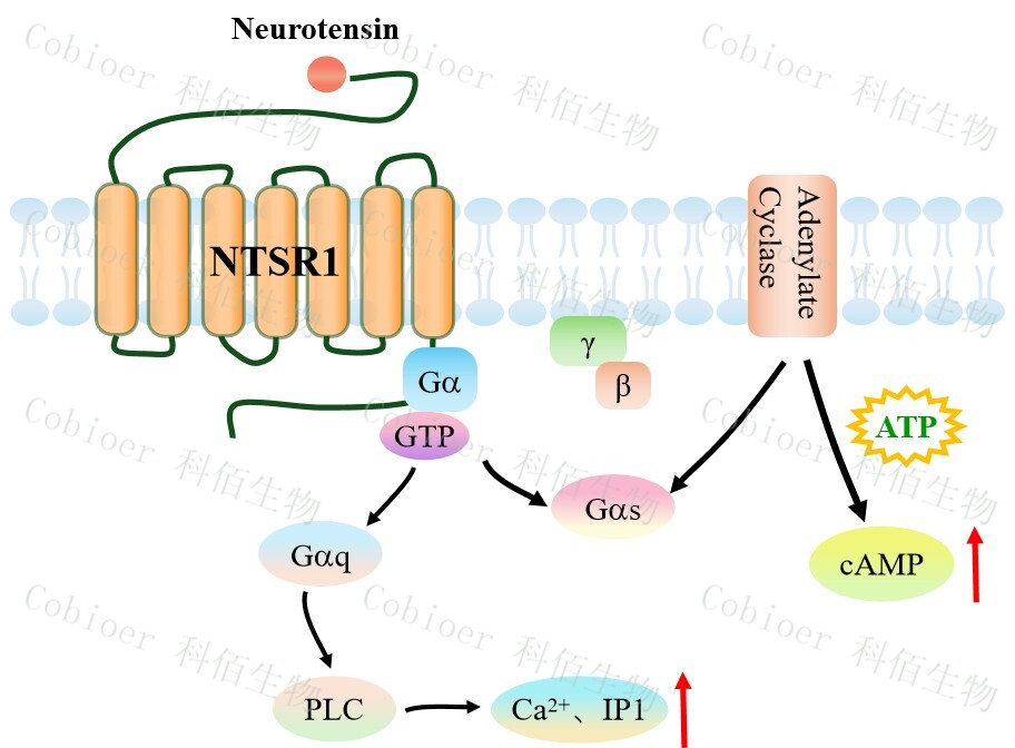 | cAMP 在 G 蛋白偶聯(lián)受體(GPCR)信號轉(zhuǎn)導(dǎo)中是一種關(guān)鍵的第二信使。當(dāng)配體結(jié)合 到 GPCR,構(gòu)象發(fā)生變化,激活受體接著激活 G 蛋白,Gs 的激活導(dǎo)致腺苷酸環(huán)化酶調(diào)控 cAMP 的升高。 NTSR1 還可以通過 Gq 蛋白的信號通路,調(diào)控 IP1 的升高。NTSR1 與配體結(jié)合,導(dǎo)致 Gαq 亞基的激活,觸發(fā) PLC-γ,從而產(chǎn)生兩個(gè)第二信使:IP3 和 DAG,它們參與細(xì)胞內(nèi)鈣 動員。由于 IP3 在代謝上不穩(wěn)定,因此測量通路激活的替代標(biāo)志物 IP1 作為檢測標(biāo)準(zhǔn)。 NTSR1 CHO 細(xì)胞藥靶模型很好的模擬了體內(nèi) NTSR1 的信號轉(zhuǎn)導(dǎo)過程,原理見下圖所示。 ![]() Figure 1. NTSR1 CHO 細(xì)胞模型原理圖 |