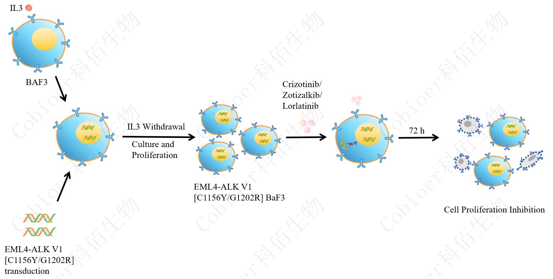 BaF3(小鼠原 B 細(xì)胞)的生長和增殖需要 IL-3 的維持。通過引入各種表達(dá)激酶的基因, 能作為 BaF3 的驅(qū)動(dòng)基因,讓 BaF3 不再依賴 IL-3 而增殖,進(jìn)而激酶基因成為 BaF3 增殖依 賴的驅(qū)動(dòng)基因,用于評(píng)估小分子藥物對(duì)激酶的靶向抑制作用,原理及流程見下圖所示。