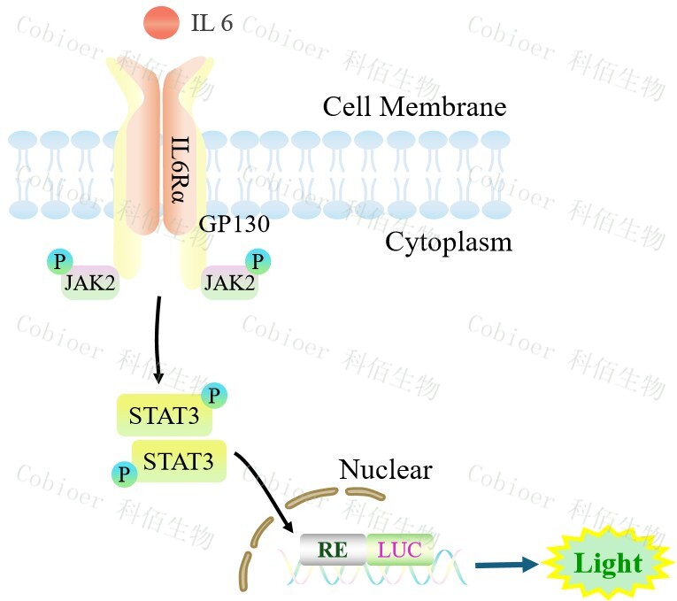 STAT3-Luc HEK293 報(bào)告基因細(xì)胞,是由 STAT3 調(diào)控并表達(dá) Luc 熒光素 酶報(bào)告基因的 HEK293 細(xì)胞。IL6 細(xì)胞因子與受體復(fù)合物結(jié)合,啟動(dòng) JAK/STAT3 信號通路,原理見下圖所示。